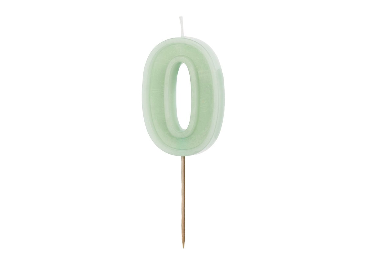 Candela di compleanno Figura 0 in verde, altezza della candela circa 6 cm, altezza della candela con bastone circa 10 cm.