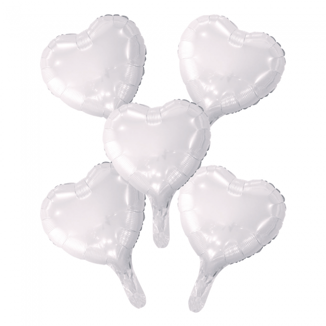 5 palloncini in foil a cuore con cannuccia di carta 9" bianchi