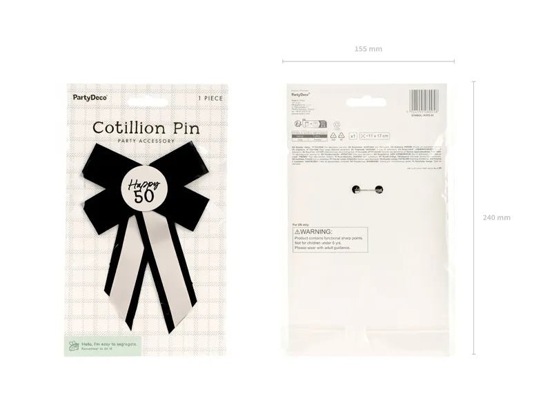 Bottone per il 50° anniversario in color crema e nero, dimensioni circa 11 x 17 cm. Il bottone viene fornito con una spilla di sicurezza.