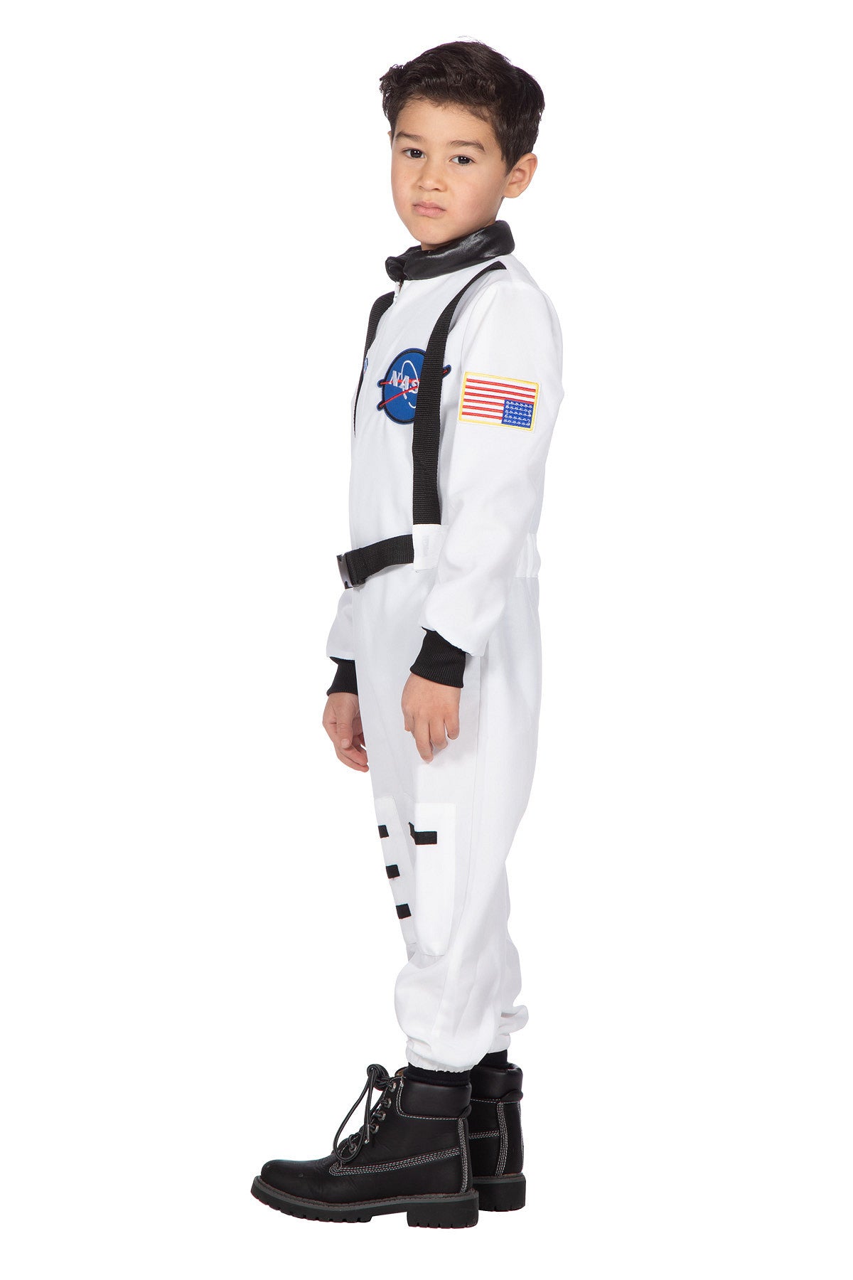 Tuta da astronauta per ragazzi in bianco con dettagli neri e blu/rossi. Perfetta per feste in maschera, eventi a tema o giochi di fantasia