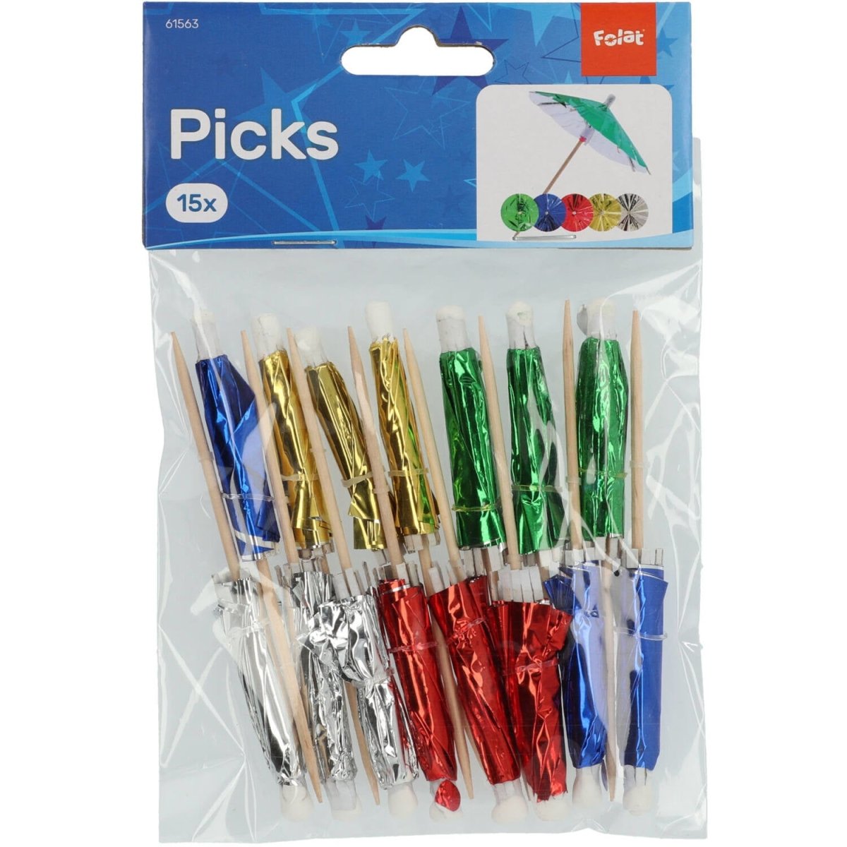 Stuzzicadenti Parasole Colori Metallici - 15 pezzi. Contenuto: 15 stuzzicadenti. Colore: metallizzato multicolore. Da utilizzare per esempio durante le seguenti occasioni di festa: compleanno, festa per bambini, festa a tema. Questi stuzzicadenti sono alti 14,5 cm. L'articolo è realizzato in bambù