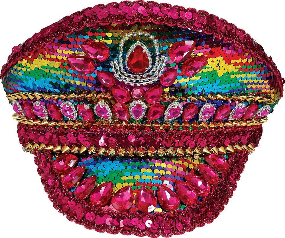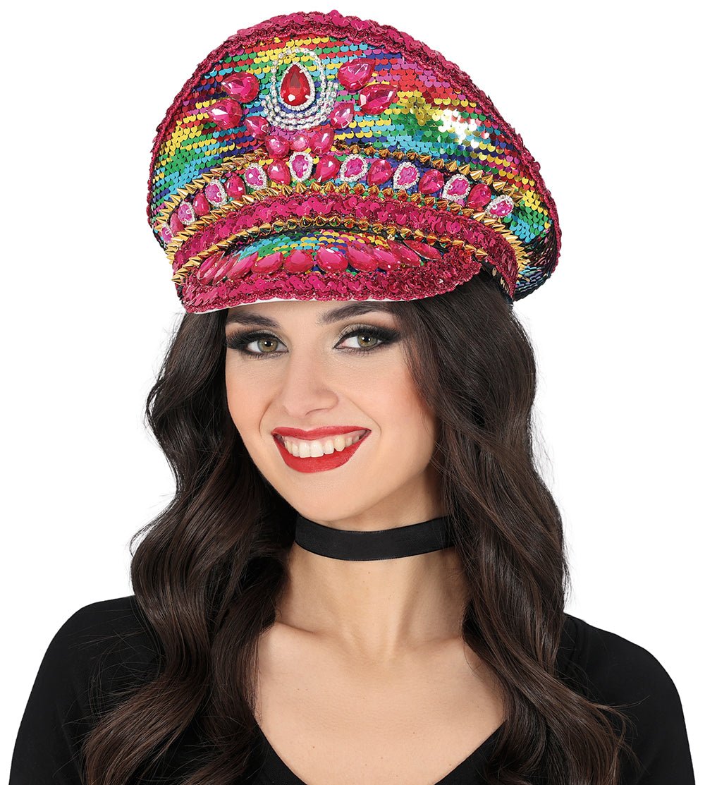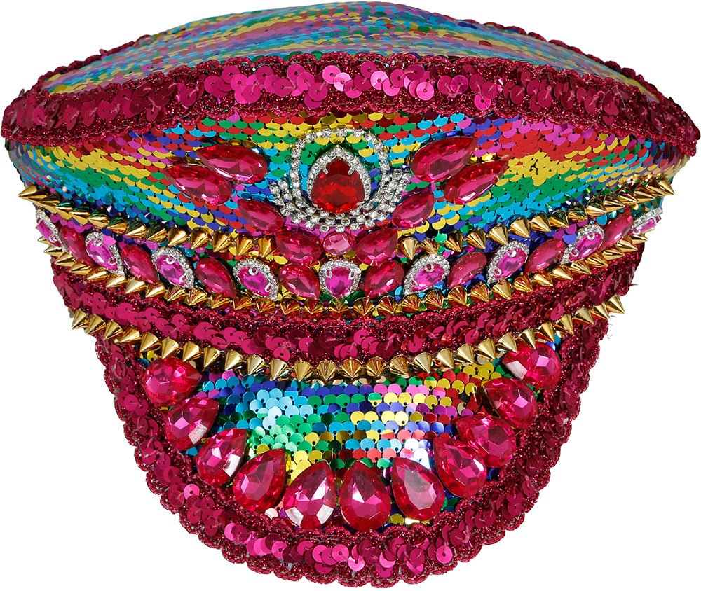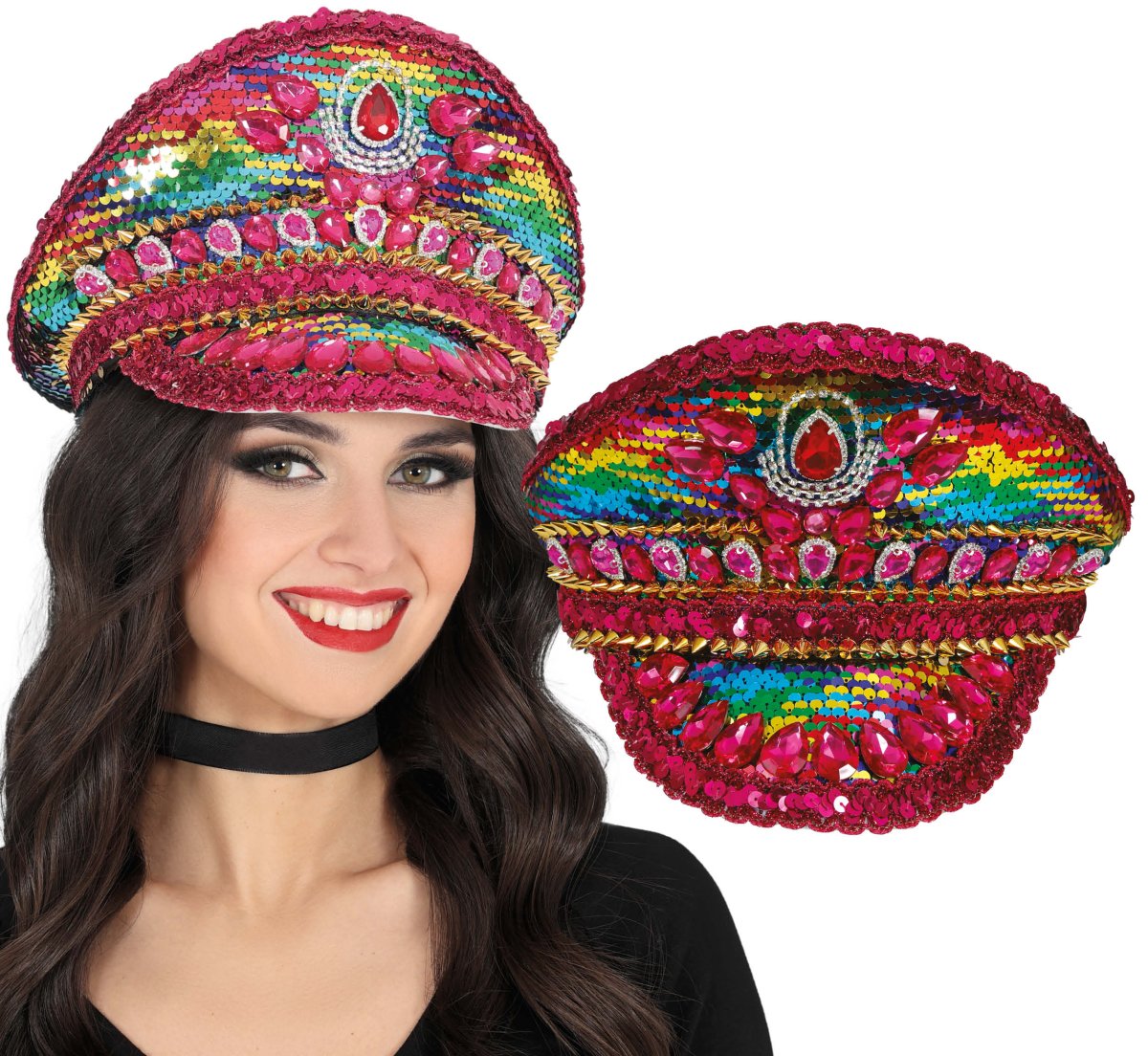 Fatti notare con questo berretto da poliziotto festivo nei colori dell'arcobaleno, rifinito con pietre scintillanti e una fascia rosa. Una perfetta combinazione di forza e allegria, ideale per feste e festival.