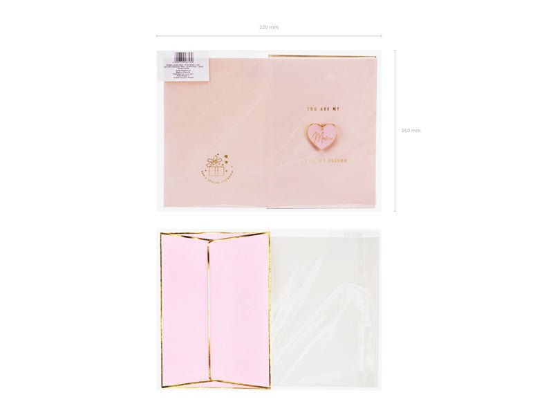 Biglietto di colore rosa con stampa metallizzata oro con spilla in rilievo a forma di cuore con scritta Mom e busta rosa con stampa metallizzata oro, dimensioni del biglietto circa 10,5 x 14,8 cm, dimensioni della spilla in rilievo circa 3 x 2,7 cm.