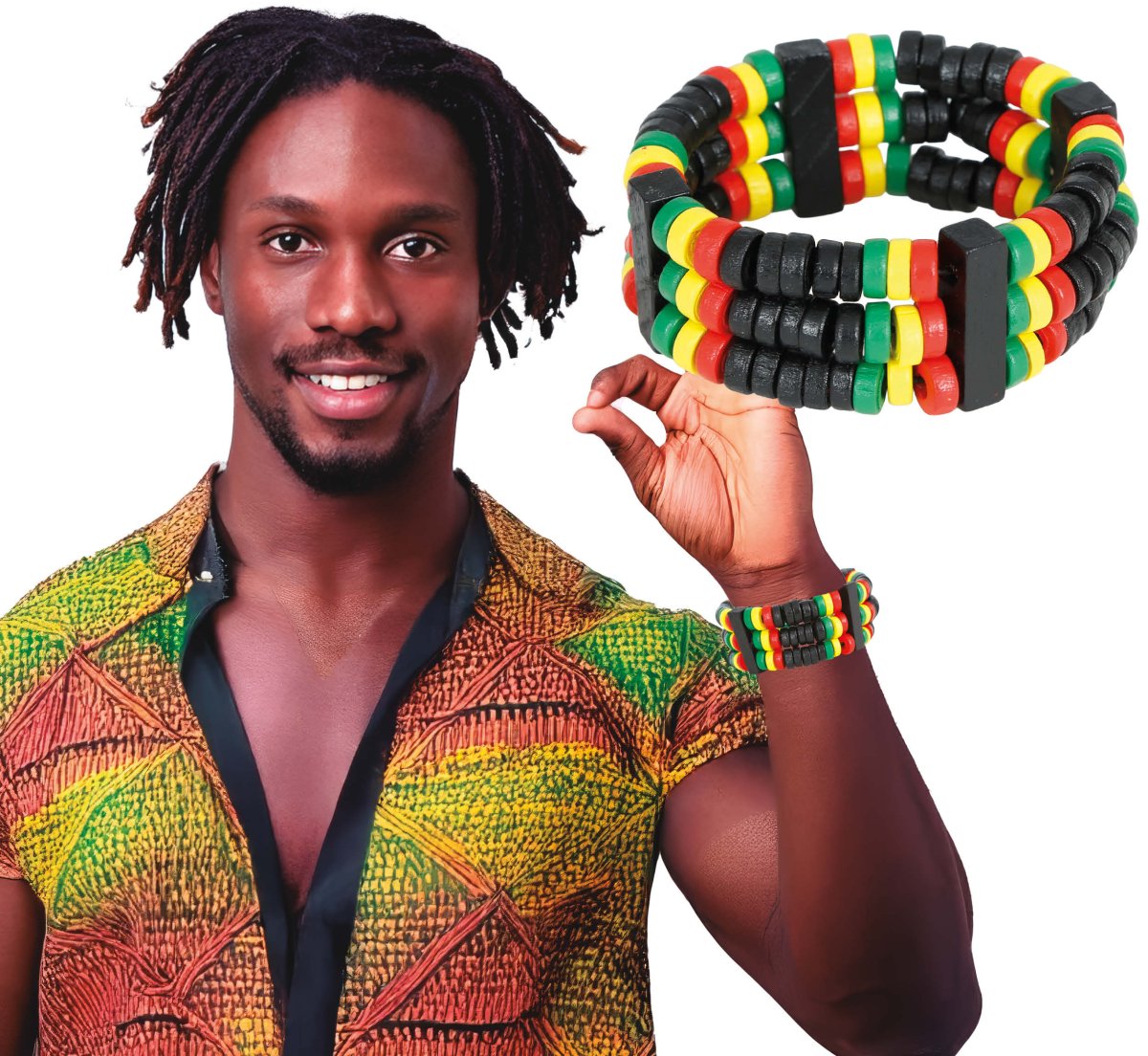 Bracciale di tendenza in stile rasta, realizzato in legno nei caratteristici colori nero, giallo e verde. Perfetto per dare un tocco allegro e colorato al tuo abbigliamento o come accessorio per feste e festival a tema.