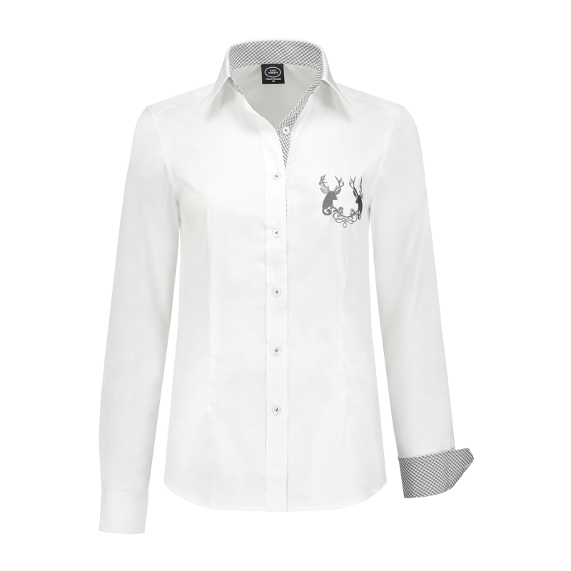 Camicetta da donna bianca, karo grigio, ricamo del cervo sul petto