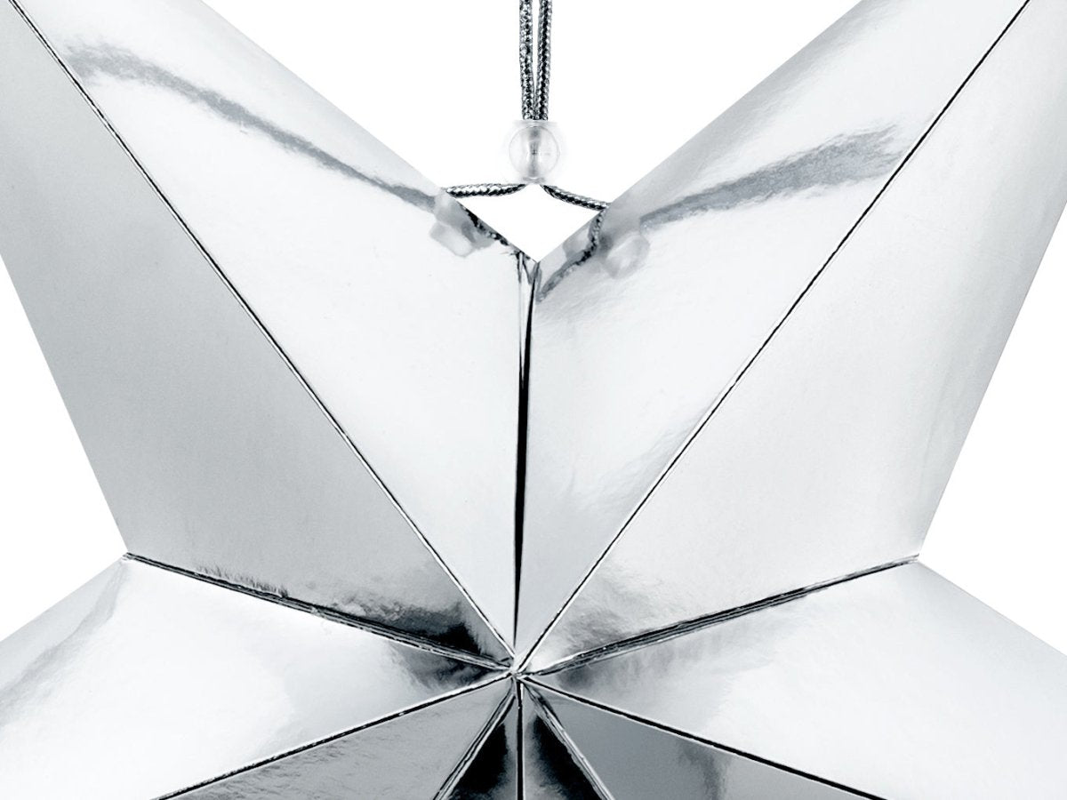 Contenuto: Stella di carta a cinque punte, realizzata in carta argentata a specchio, con cordoncino argentato, diametro circa 70cm. Prodotto fai da te.