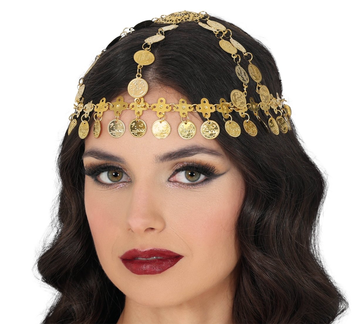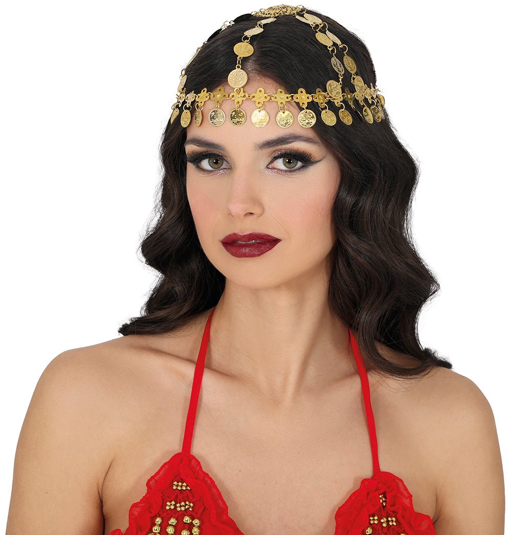 Dai al tuo abbigliamento un aspetto elegante e festoso con questo cerchio d'oro con monete. Ideale come accessorio per feste a tema, spettacoli di danza o come dettaglio accattivante per un costume. Il cerchietto è leggero e comodo da indossare