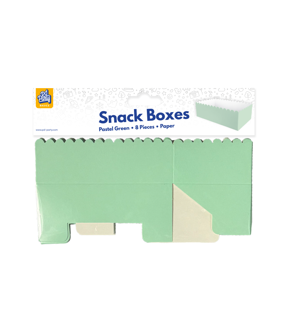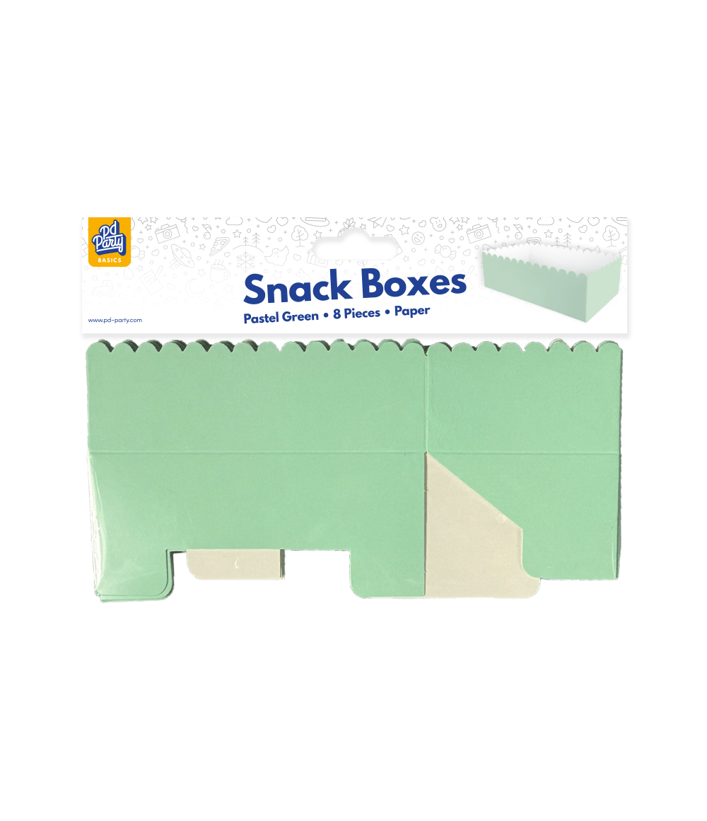 Le scatole per snack - Verde pastello sono l'articolo perfetto per servire snack come popcorn e patatine in occasione di una festa che ha come tema il verde pastello. Queste scatole per snack hanno dimensioni di 7 x 7 x 12,5 cm, sono confezionate per 8 e si abbinano perfettamente agli altri articoli verde pastello come coriandoli, tovaglioli, piatti, tovaglie, tazze e bandiera. Presenta questi articoli insieme in modo che sia subito chiaro al cliente in cosa consiste questa collezione. Queste scatole per merenda sono realizzate in carta e sono quindi una scelta ecologica