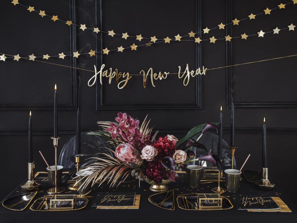 Contenuto: striscione cucito Buon Anno in carta oro a specchio, lunghezza circa 66cm, altezza circa 18cm.