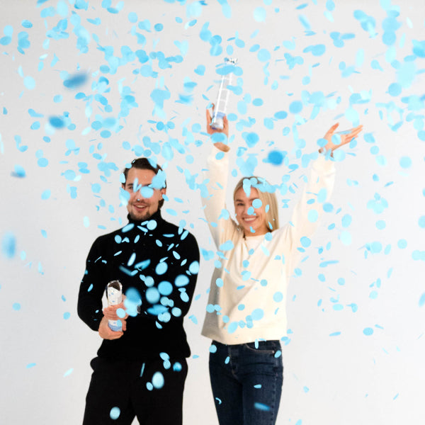 I cannoni di coriandoli sono il pezzo forte di ogni festa. Creano un'impressionante cascata di colori e creano momenti speciali. Cannone di coriandoli con coriandoli di carta velina azzurri
