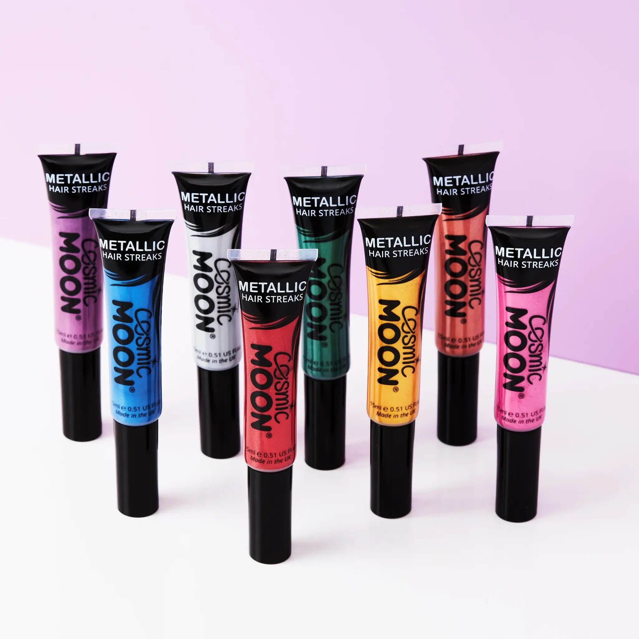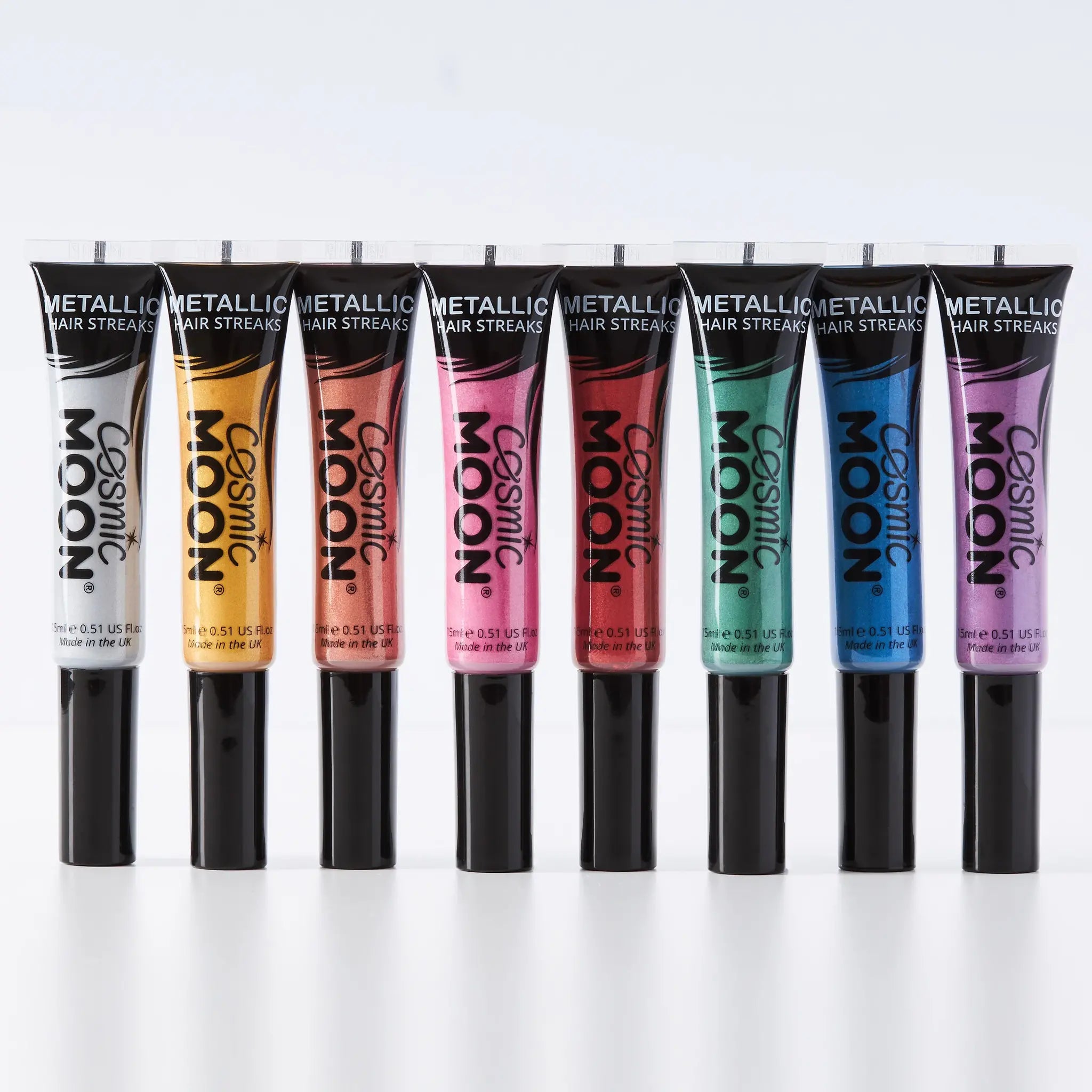 Cambia istantaneamente il colore dei tuoi capelli con uno di questi 8 colori metallizzati di alta qualità. Facile da applicare con un pennello e da rimuovere con lo shampoo.