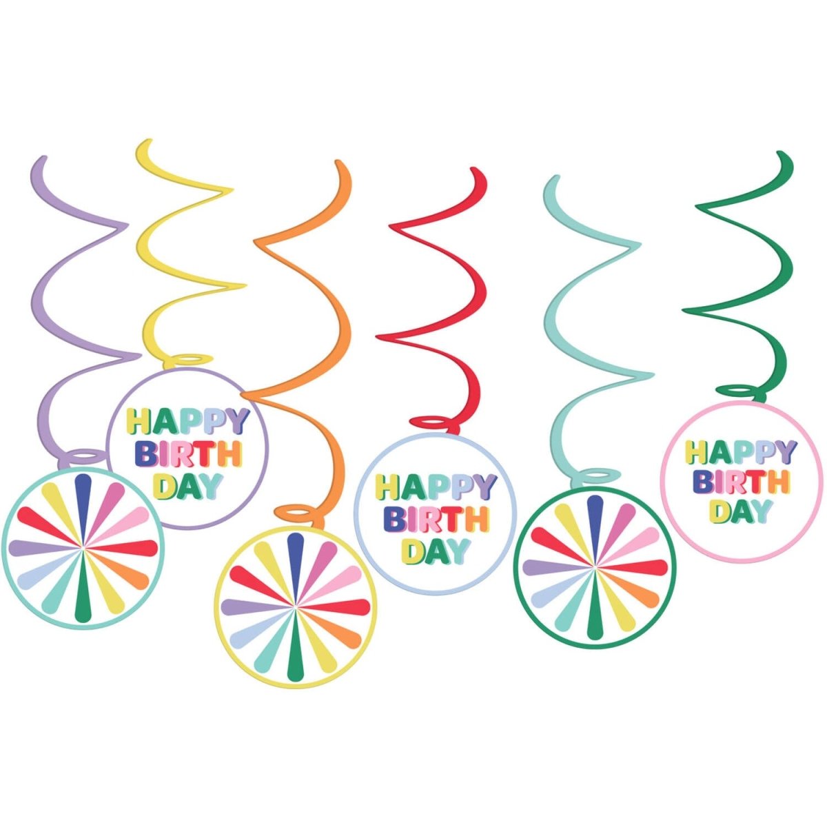 Questa festa è sempre in movimento. Decorazione da appendere - Stripetastic - 6 pezzi. Contenuto: 6 pezzi di decorazione da appendere. Da utilizzare, ad esempio, durante le seguenti feste/occasioni di festa: Festa per bambini, Festa a tema, Festival. 6 pezzi di decorazione da appendere: 3 cerchi con strisce colorate, ognuno con un motivo diverso e 3 cerchi con il testo "HAPPY BIRTH DAY". Tutti su ghirlande di colori diversi. Le decorazioni sono larghe circa 13 cm, lunghe 60 cm (appese) e facili da appendere grazie al laccio (lungo +/- 7 cm). Stampate su entrambi i lati. Adatte per compleanni e feste tutto l'anno. Questo set di decorazioni appartiene alla nostra collezione Stripetastic di