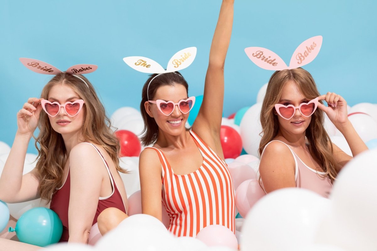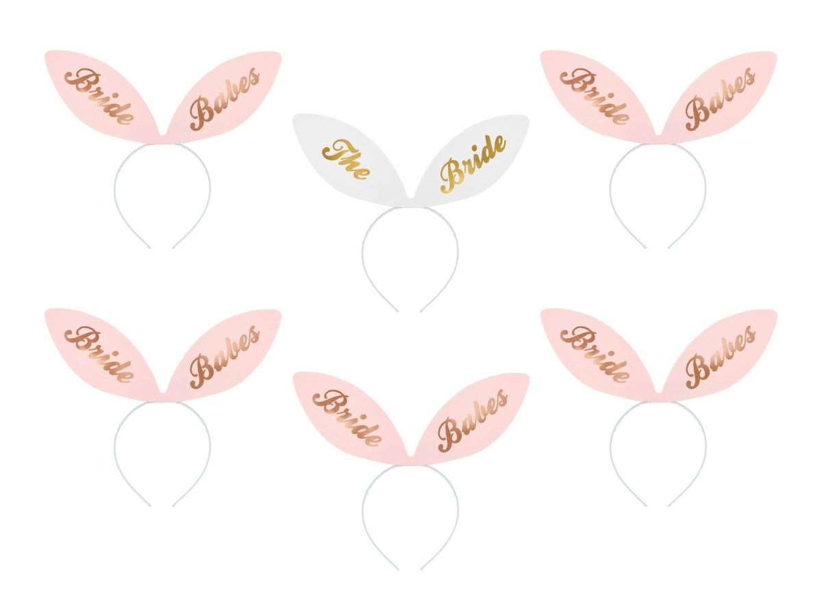 Set di 6 elastici per capelli con orecchie Squadra della Sposa, 5 elastici per capelli rosa con la scritta "Bride Babes" e 1 elastico per capelli bianco con la scritta "The Bride". Dimensioni circa 29x25 cm