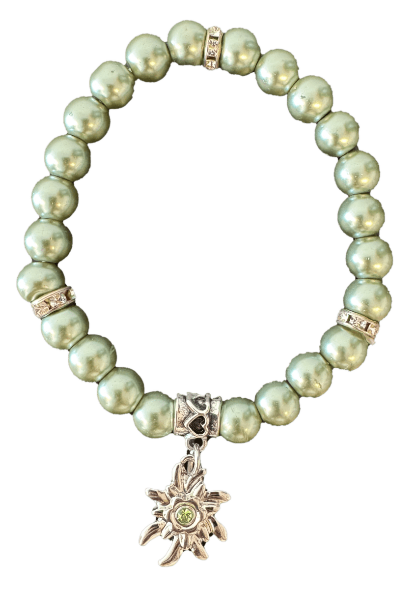 Aggiungi un tocco naturale ed elegante a qualsiasi outfit con questo bracciale verde con perle e stelle alpine. Il design elegante rende il braccialetto adatto per essere indossato tutti i giorni o come regalo speciale.