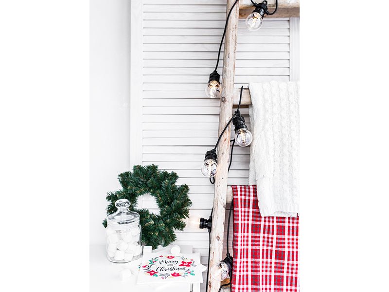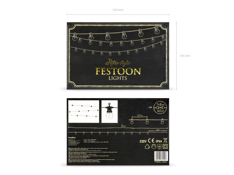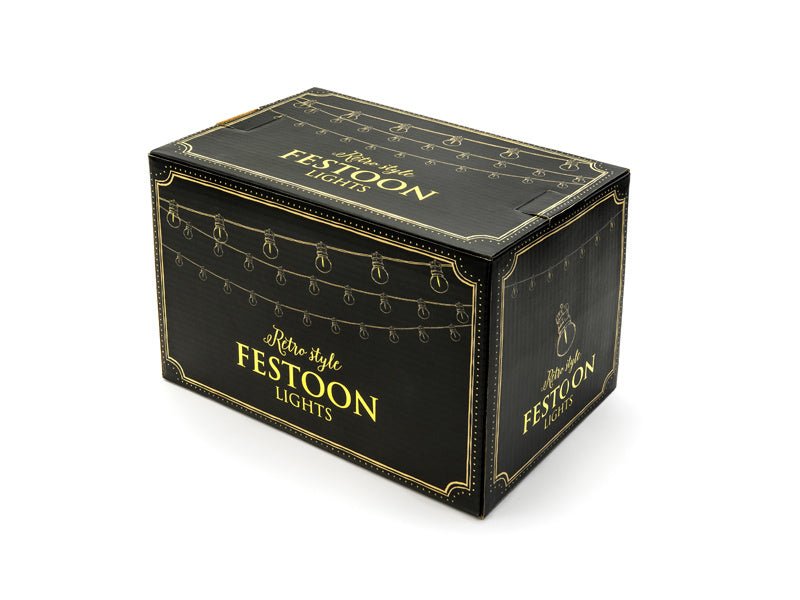 Lampadine LED a festone Retro, trasparenti su filo nero, lunghezza del filo con le lampadine circa 5 m, filo aggiuntivo circa 3 m, 10 lampadine rotonde, colore giallo caldo della luce. Adatte sia per l'interno che per l'esterno. Le luci possono essere collegate fino a 5 set. Non include la spina UK.