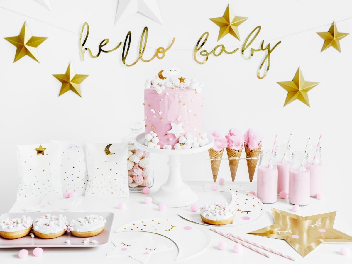 Contenuto: striscione cucito Little Star - Baby by Hello in carta a specchio di colore oro, lunghezza circa 70 cm, altezza circa 18 cm.