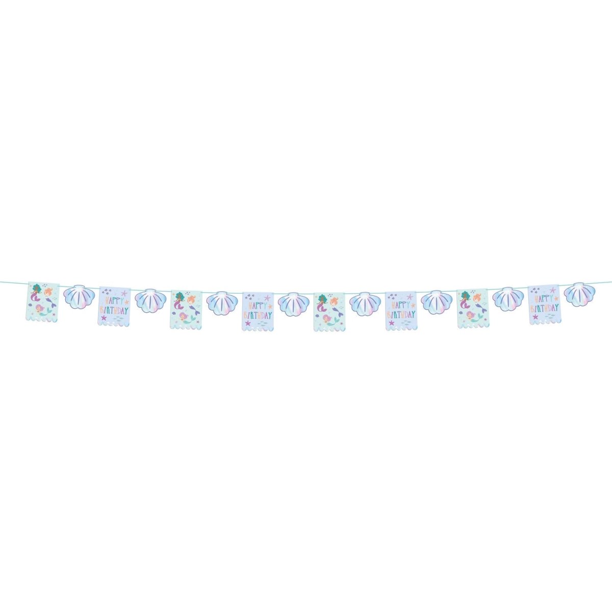 Un mondo sottomarino scintillante. Linea di bandiere - Mermaid Magic - 6 metri. Contenuto: 1 filo per bandiere. Da utilizzare ad esempio durante le seguenti occasioni di festa: Festa per bambini, Compleanno. Questo filo per bandiere rende la festa una vera festa di sirene. Su questo filo per bandiere lungo 6 metri ci sono 16 bandiere di circa 17 x 21 cm. Ci sono 3 tipi di bandierine: una verde menta con 3 sirene e un bordo smerlato iridescente, una coppia di bandierine blu con il testo "HAPPY BIRTHDAY" e un bordo smerlato iridescente e una bandierina completamente iridescente a forma di conchiglia per un tocco di luce subacquea in più. Grazie alla tecnica di stampa a caldo utilizzata, le parti iridescenti brillano davvero! Le bandierine sono stampate su due lati. Possono essere fatte scorrere avanti e indietro sul nastro turchese. Questa linea di bandierine appartiene alla collezione Mermaid Magic di