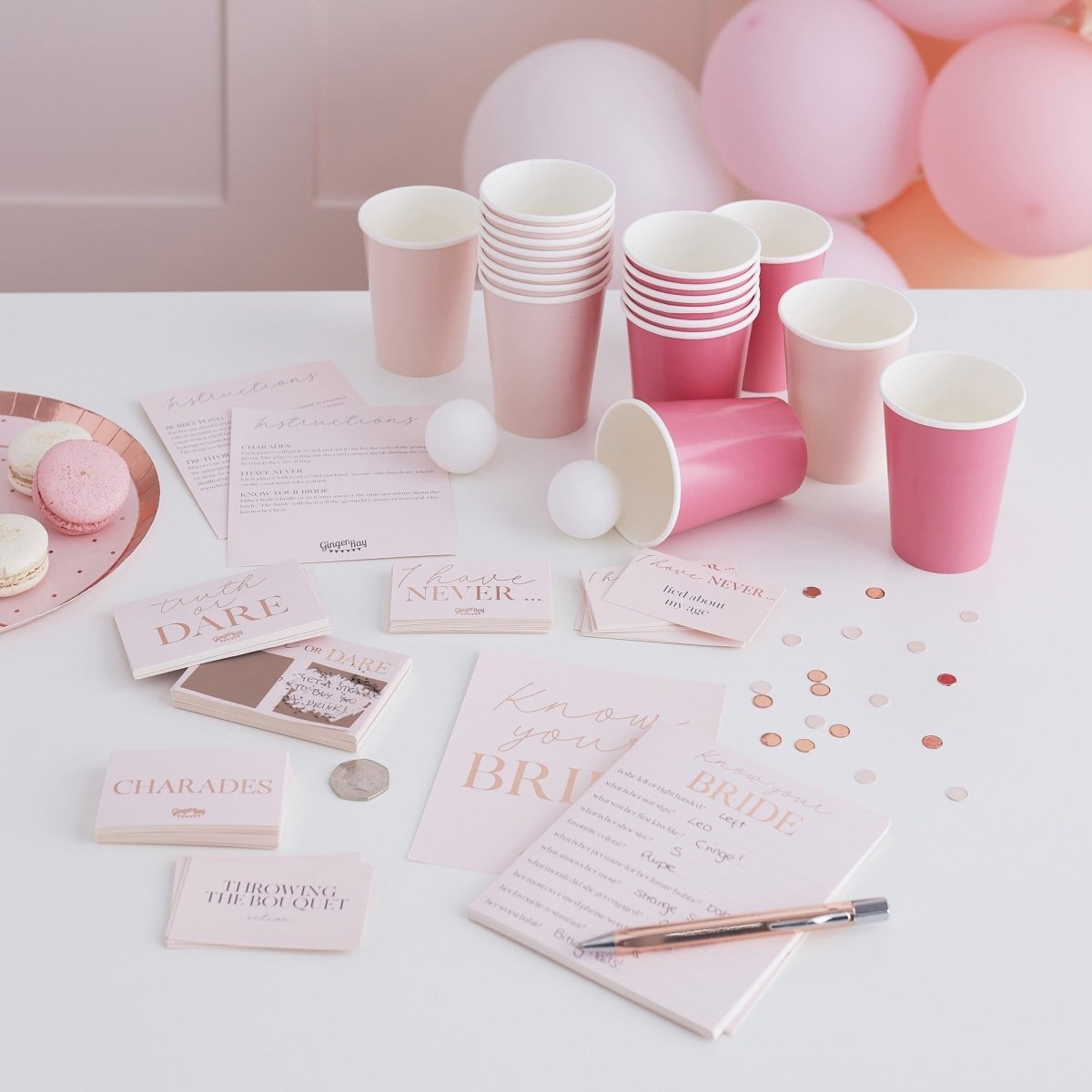 Ogni confezione contiene 5 divertenti giochi di addio al nubilato che comprendono: 20 tazze e 2 palline da pong 20 carte "Non li ho mai avuti" 20 carte "Sciarada" 20 carte "Obbligo o verità" 10 carte "Conosci la tua sposa" e 1 foglio di istruzioni.