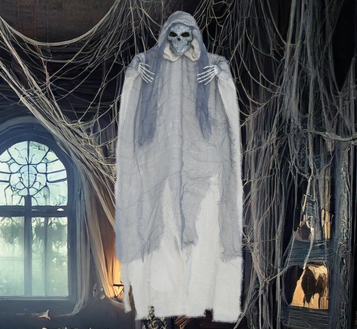 Bambola di Halloween scheletro grigio con mantello