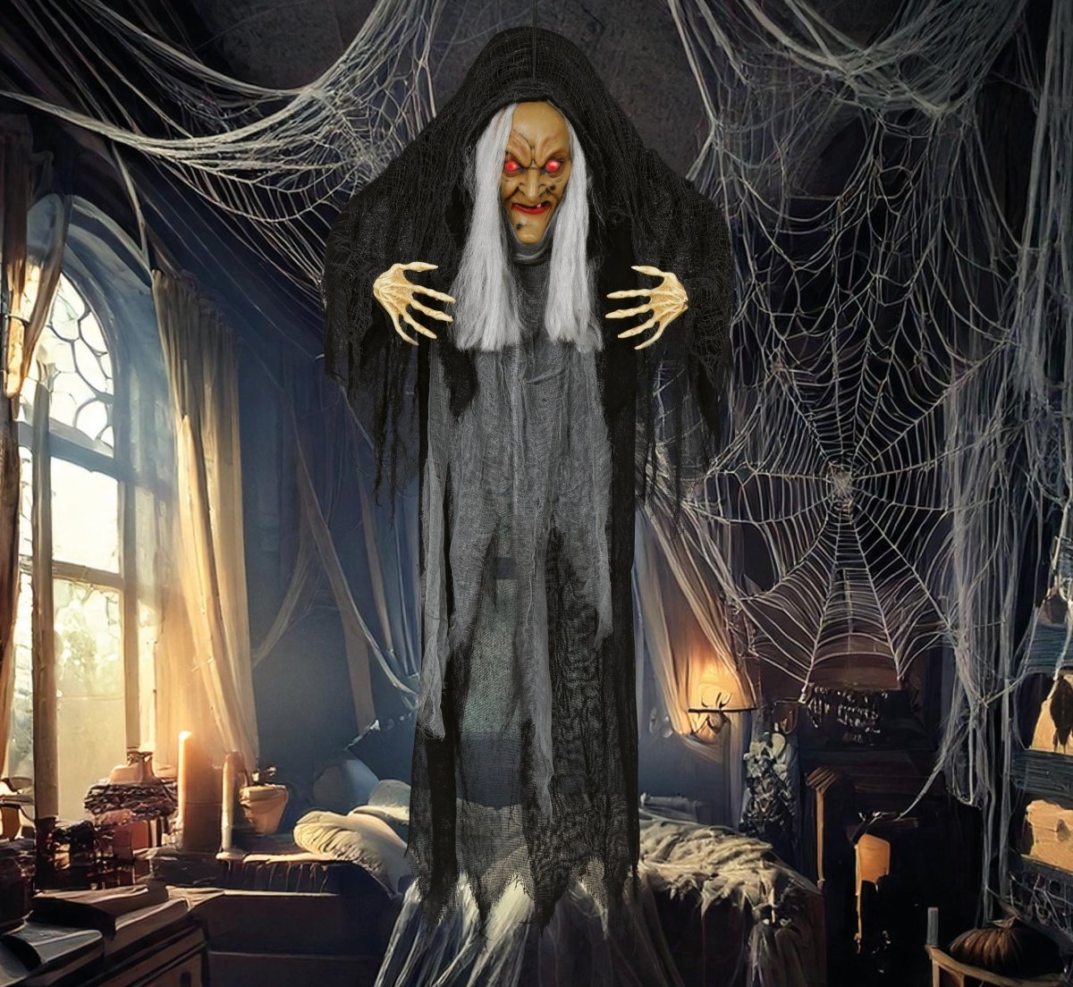 Bambola strega di Halloween con luci, suoni e movimenti 1,20m