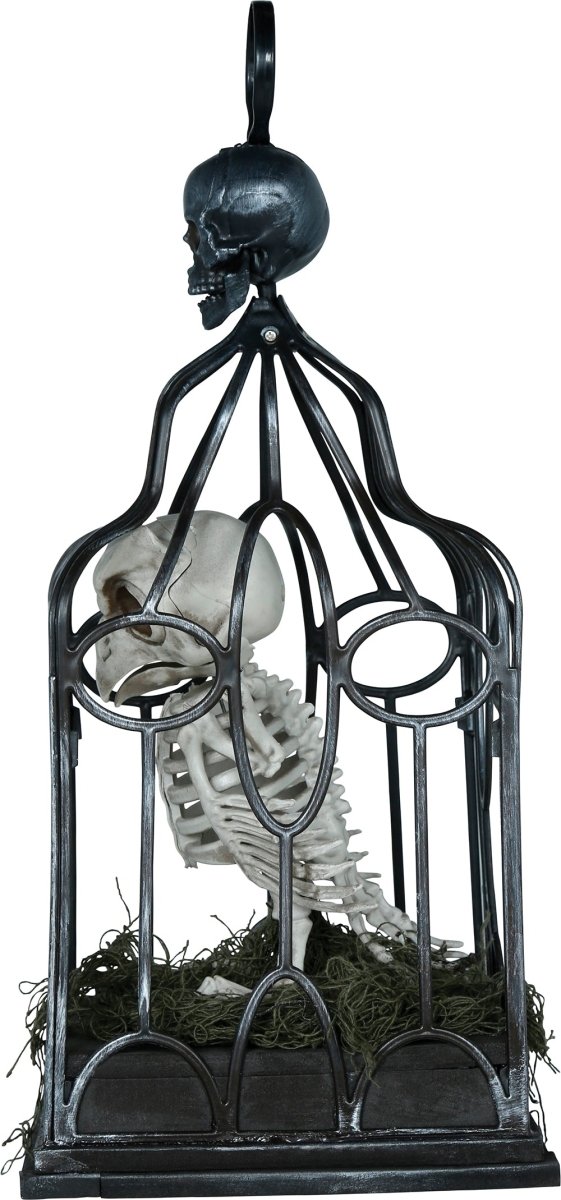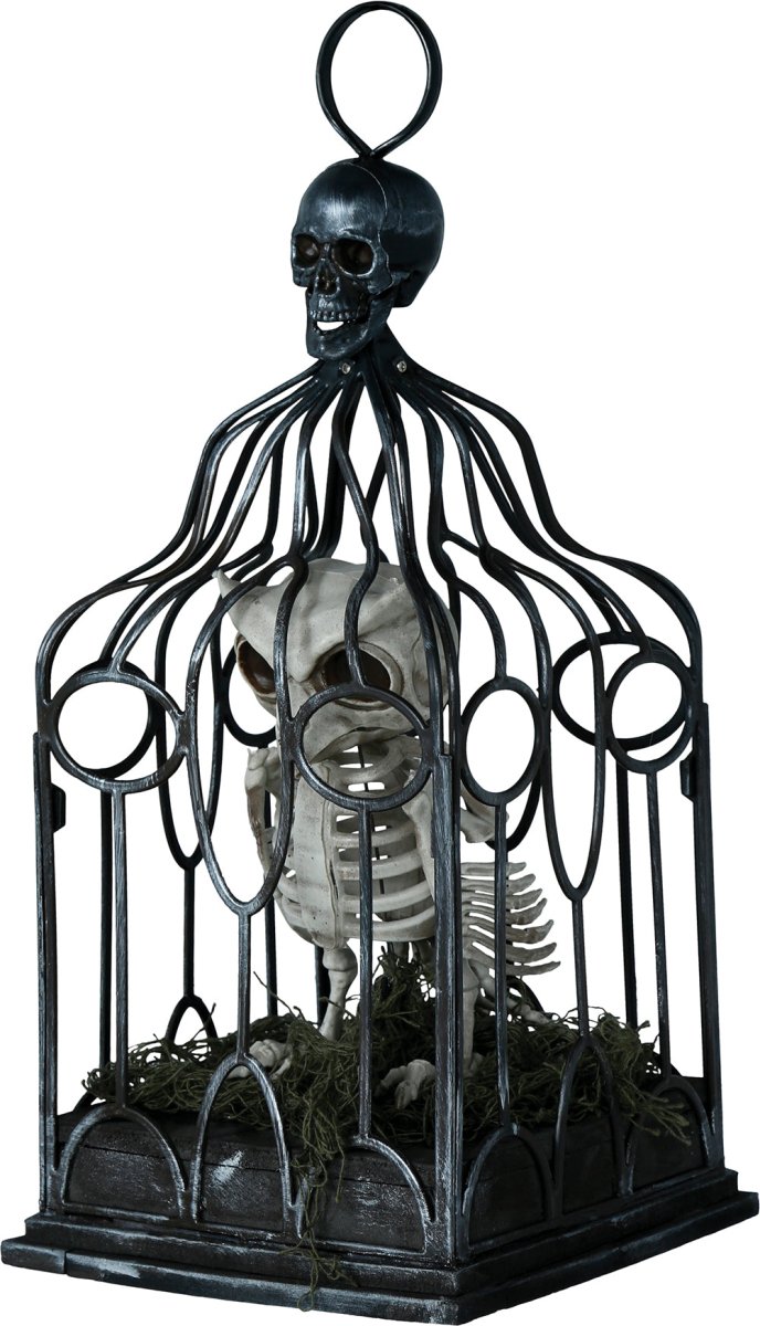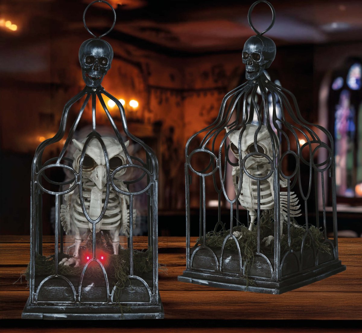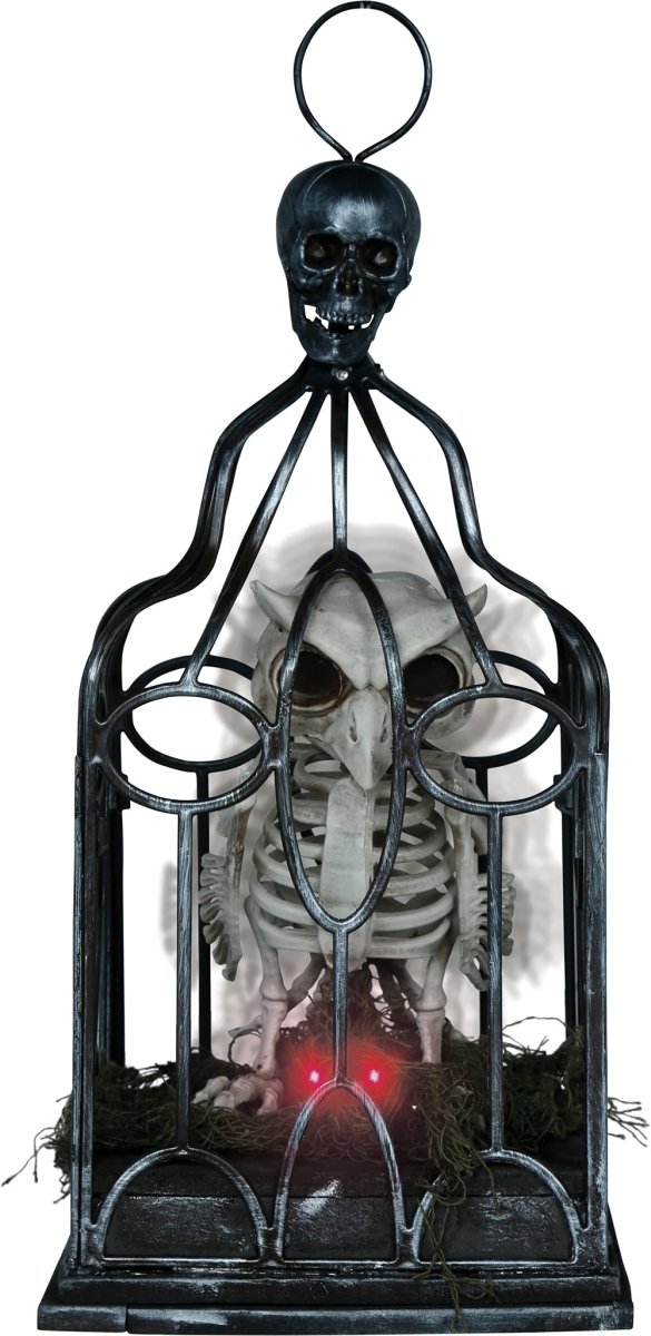 Gufo scheletrico di Halloween in gabbia con luci, suoni e movimento