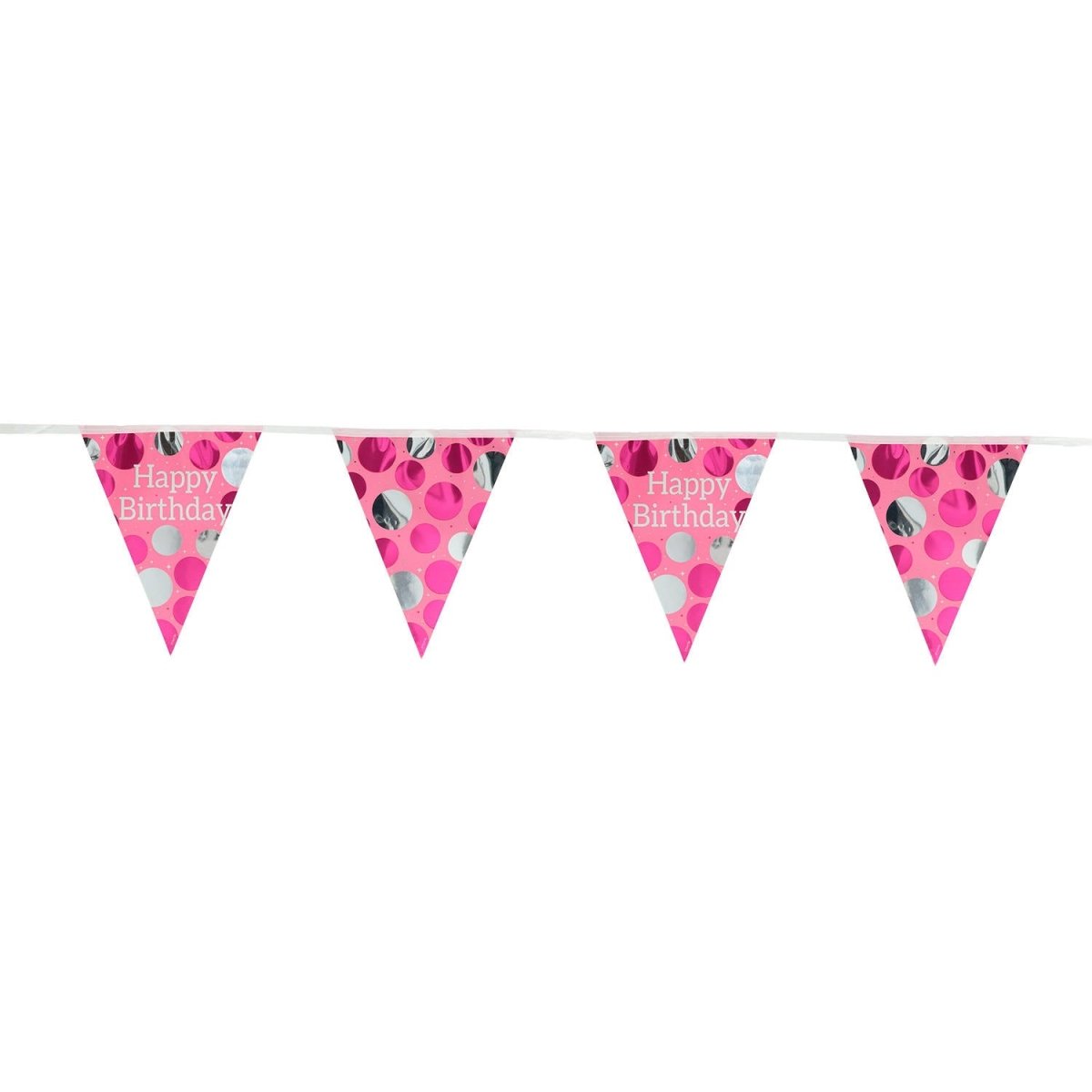 Bandiera Rosa Lucido 'Happy Birthday' - 4 metri. Contenuto: 1 linea di bandiera di 4 metri. Colore: rosa. Da utilizzare, ad esempio, durante le seguenti occasioni di festa: Compleanno, Festa per bambini e Festa per adolescenti. Questa ghirlanda è lunga 4 metri. L'articolo è realizzato in carta stagnola.