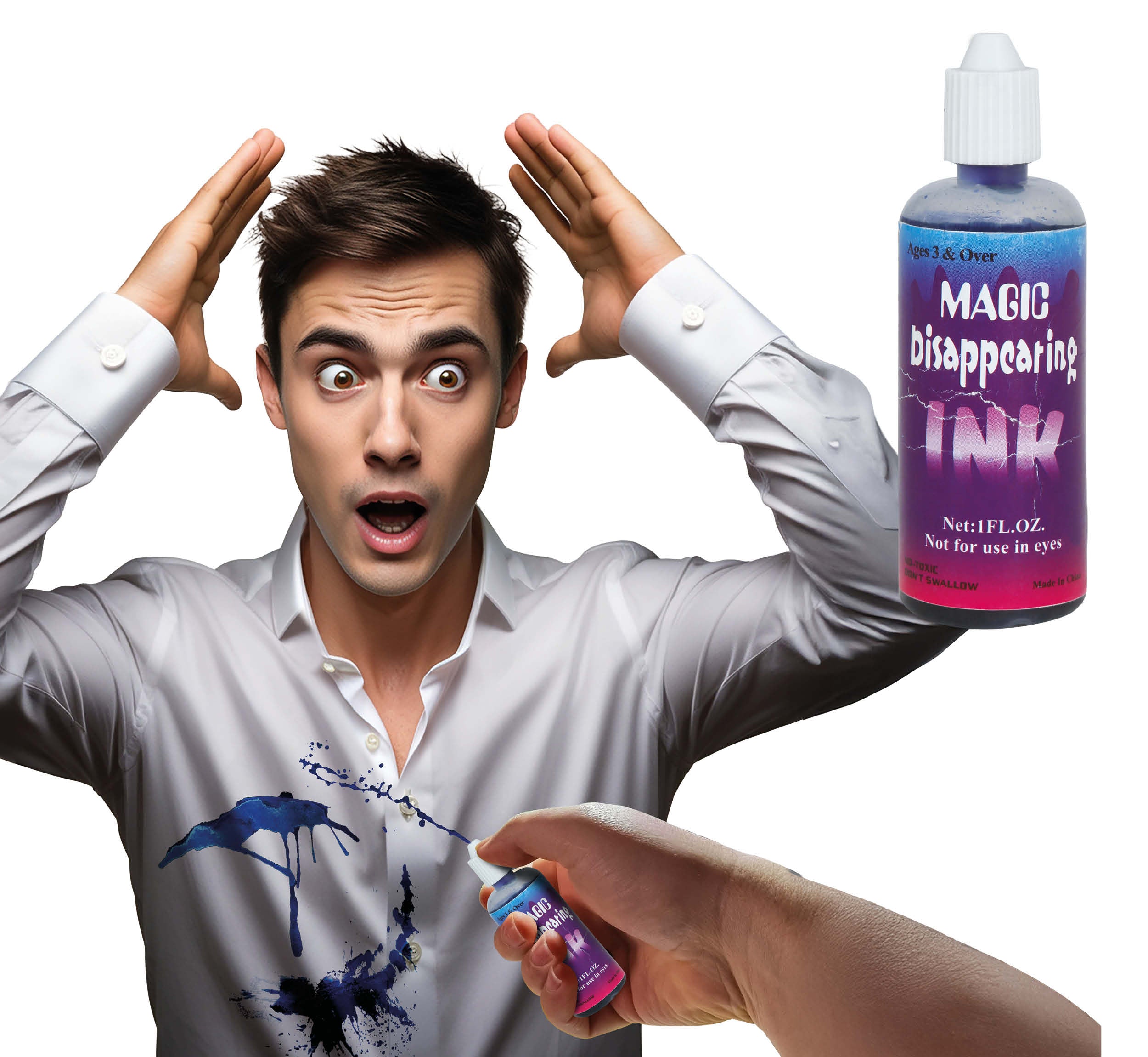 Sorprendi i tuoi amici con questo divertentissimo Inchiostro Magico! L'"inchiostro magico" blu lascia una macchia realistica non appena lo fai gocciolare su carta o vestiti, ma... dopo poco tempo, la macchia scompare da sola! Perfetto per i momenti di depressione, per le situazioni umoristiche e per un regalo spensierato.
