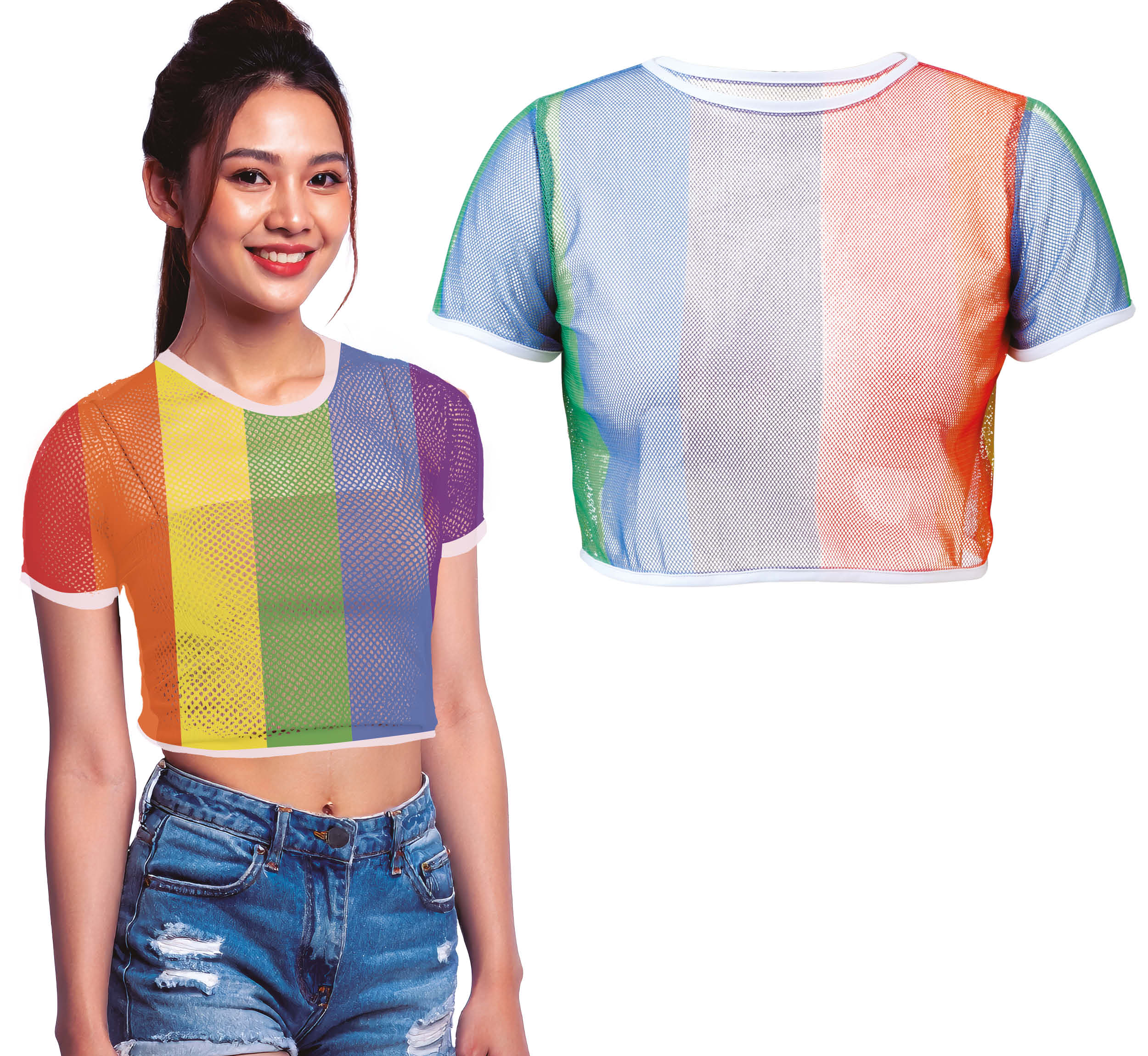 Distinguiti con questa coloratissima T-shirt Rainbow Mesh. Il tessuto a rete traslucido e i vivaci colori dell'arcobaleno rendono questa maglietta perfetta per i festival, le feste a tema o per un look streetwear accattivante.