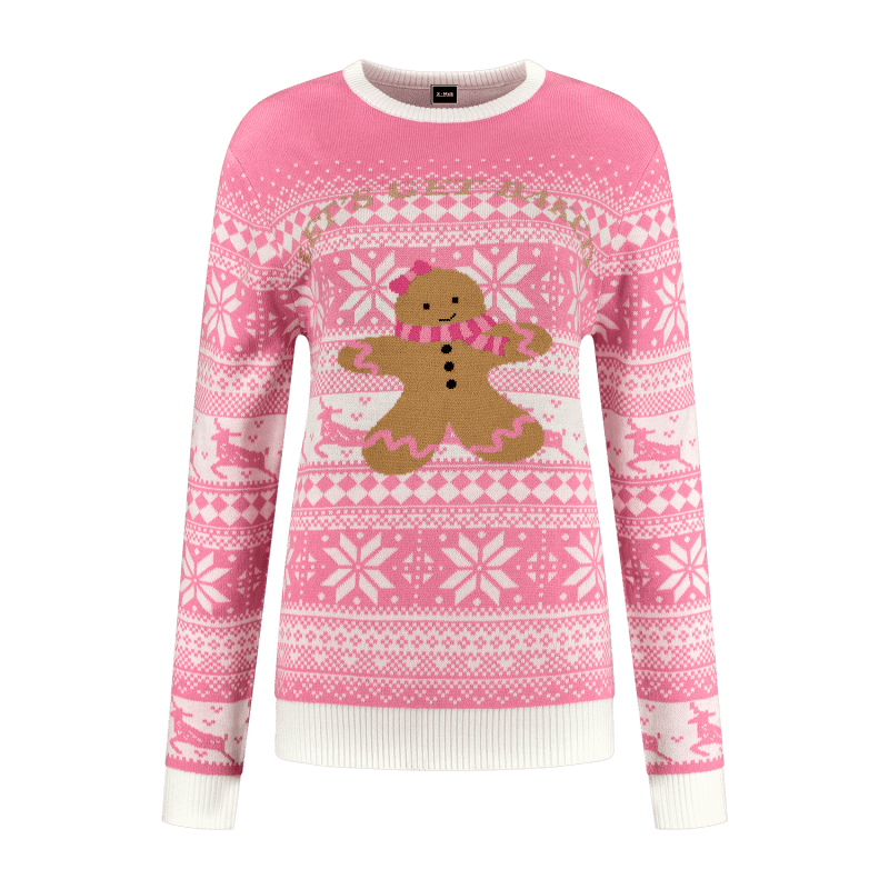 Con questo maglione natalizio rosa di pan di zenzero da donna aggiungerai immediatamente uno spirito natalizio allegro e dolce al tuo abbigliamento. Il maglione presenta un design giocoso con simpatiche figure di pan di zenzero su uno sfondo rosa tenue, che lo fa risaltare tra tutti i tradizionali colori natalizi. Perfetto per chi ama un look fresco, moderno e festoso