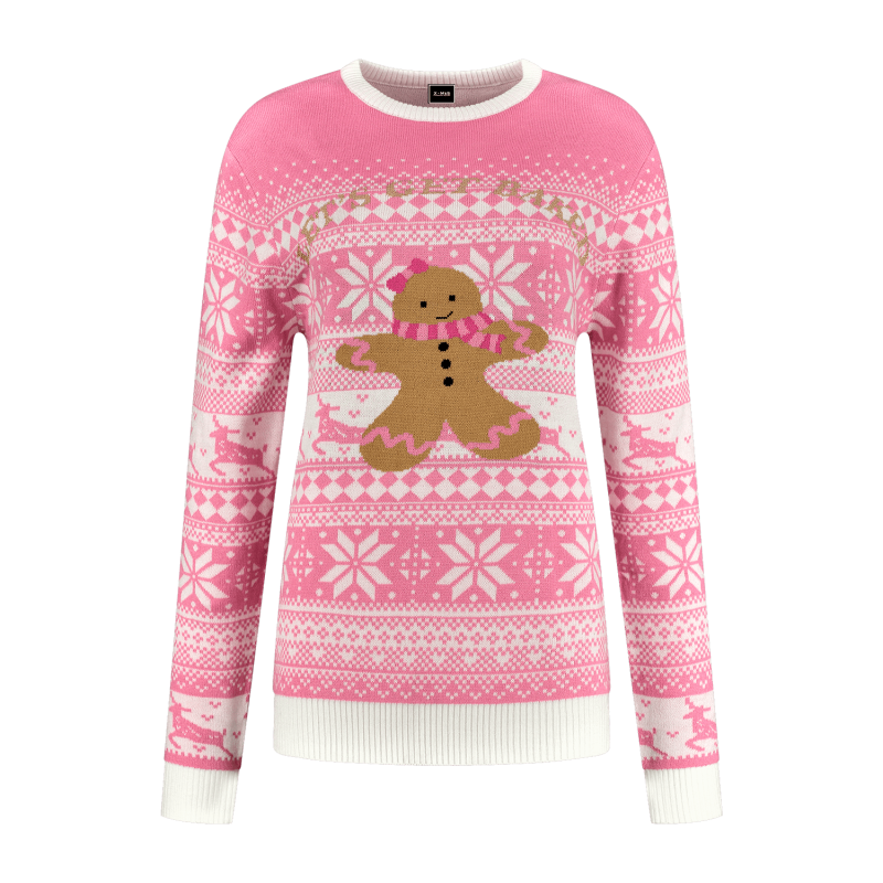 Con questo maglione natalizio rosa di pan di zenzero da donna aggiungerai immediatamente uno spirito natalizio allegro e dolce al tuo abbigliamento. Il maglione presenta un design giocoso con simpatiche figure di pan di zenzero su uno sfondo rosa tenue, che lo fa risaltare tra tutti i tradizionali colori natalizi. Perfetto per chi ama un look fresco, moderno e festoso