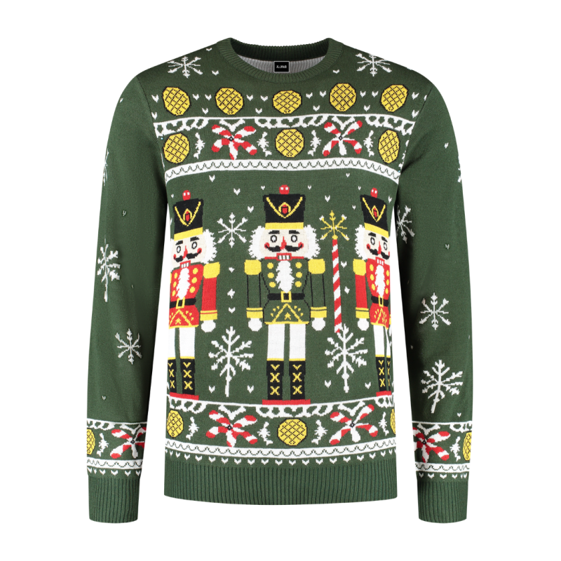 Questo maglione di Natale Trio Schiaccianoci da uomo aggiungerà immediatamente un tocco classico e festivo al tuo abbigliamento. Il maglione ha una base verde scuro ed è decorato con tre accattivanti personaggi di schiaccianoci, creando un look natalizio tradizionale ed elegante. Perfetto per chi ama un maglione natalizio elegante e di carattere