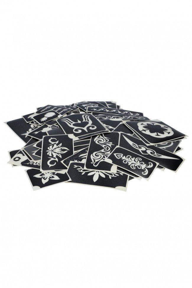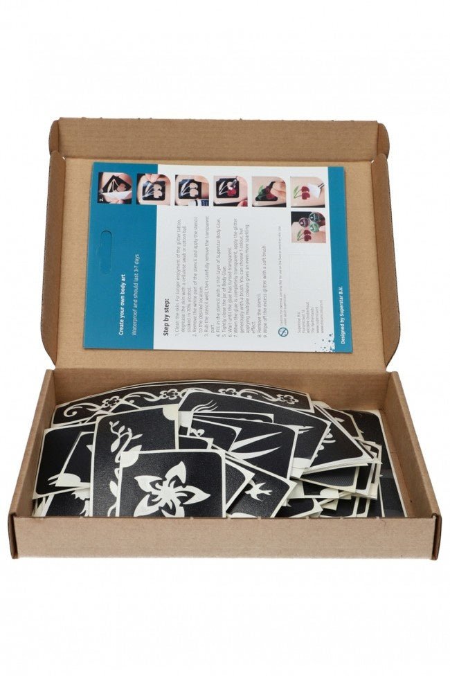 Il set contiene 100 stencil per tatuaggi glitterati. Usa la speciale colla per pelle e i brillantini per creare splendidi tatuaggi glitterati