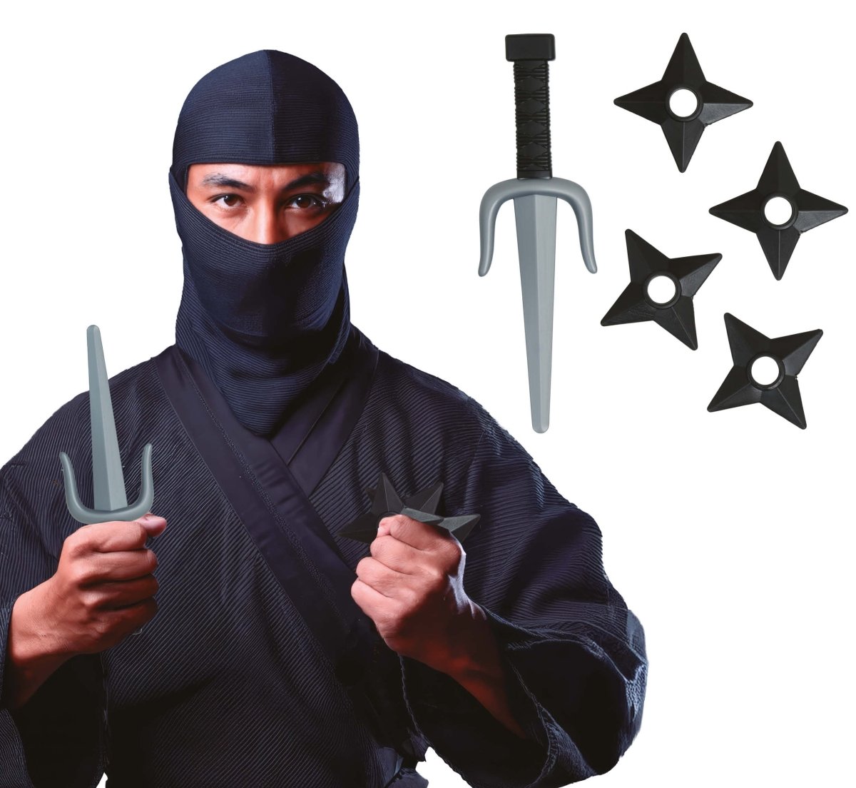 Vivi un'avventura come un vero ninja con questo set completo da 5 pezzi. Il set contiene tutto il necessario per feste in costume, giochi di ruolo o feste a tema. Realizzato in PVC leggero e robusto e rifinito nei toni dell'argento e del nero per un look sempre alla moda