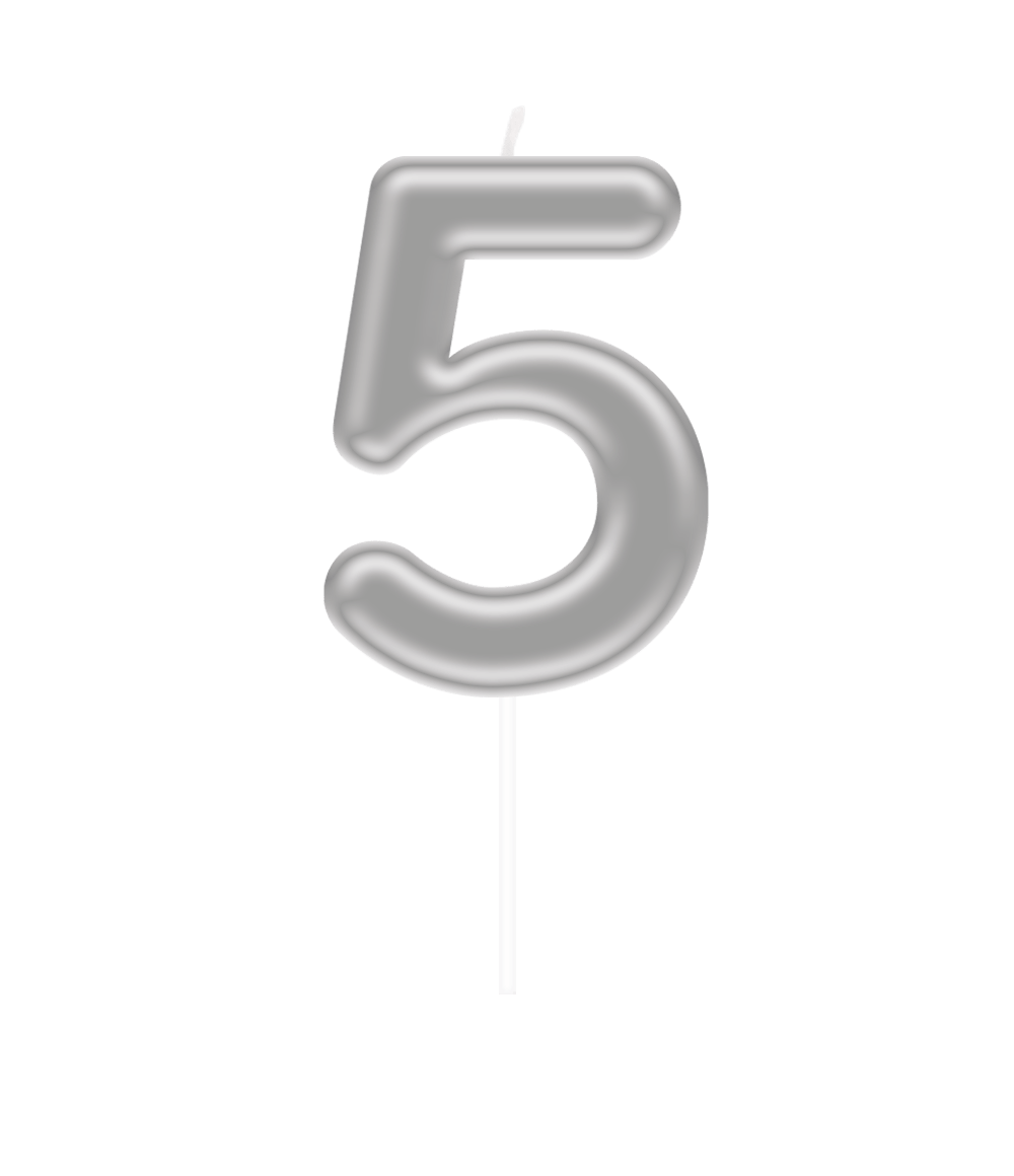 Festeggia con stile ogni traguardo con questa candela numerica argento "5". Perfetta per segnare età, anniversari o altre occasioni speciali. Il colore argento lucido fa risaltare la candela su qualsiasi torta o cupcake