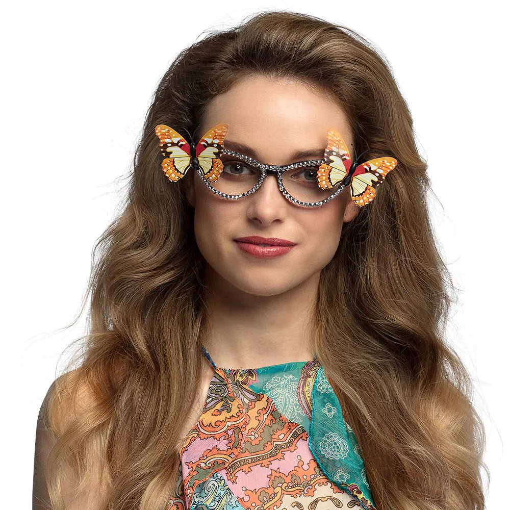 Questi speciali occhiali retrò sono un'aggiunta elegante e giocosa a qualsiasi look da festa. Gli occhiali hanno una montatura anni '50 con pietre lucide e farfalle ai lati. Un ottimo accessorio per un costume da hippie o da fata per feste a tema o per il Carnevale.