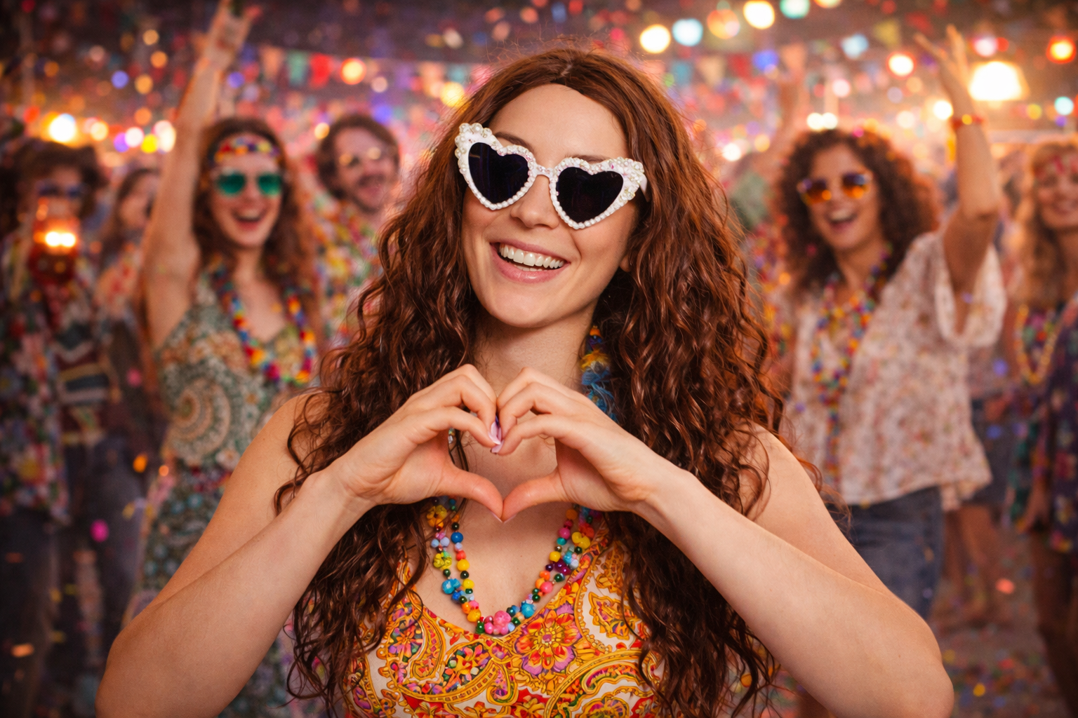 Gli occhiali Love Pearls sono un accessorio elegante e accattivante, perfetto per il carnevale e altre occasioni di festa. Il design a forma di cuore, rifinito con dettagli di perle, dona a qualsiasi outfit un look giocoso ed elegante.