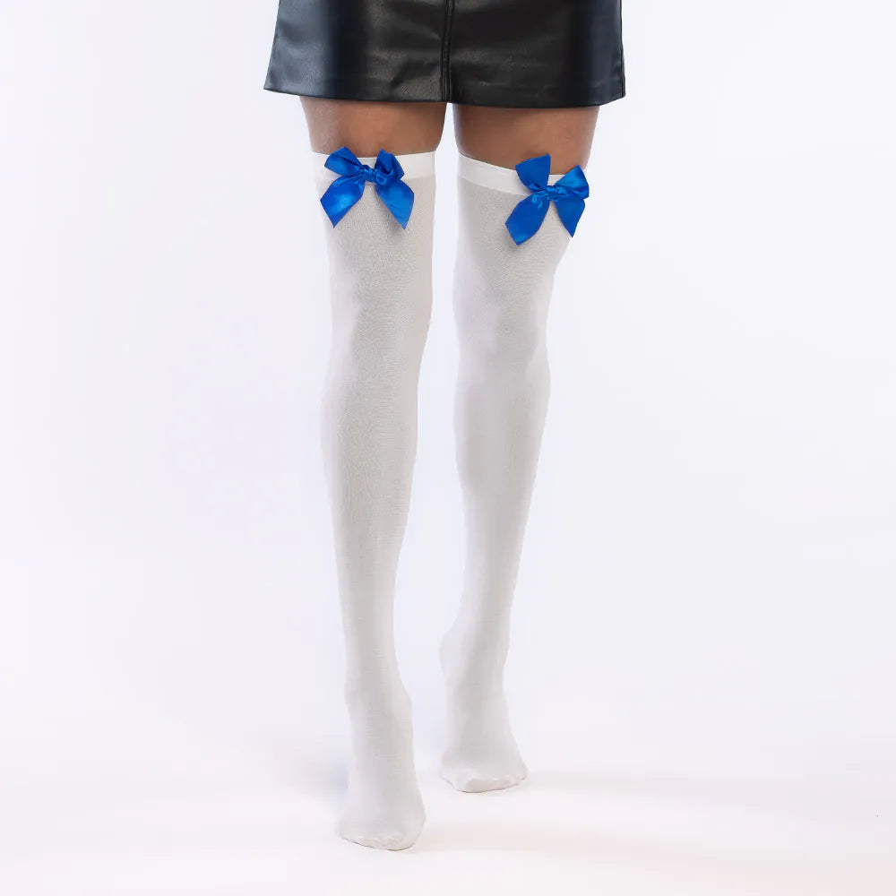 Queste calze bianche con fiocchi blu satinati daranno al tuo abbigliamento un tocco allegro e malizioso. Ideali per travestirti da scolaretta, da personaggio delle fiabe o se semplicemente ami i dettagli accattivanti, questo accessorio ti farà perdere la testa!