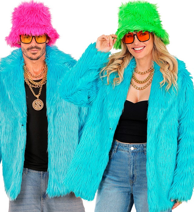 Questo pellicciotto di colore turchese è un capo fresco e accattivante, perfetto per un outfit festivo e colorato. Ideale per il Carnevale, feste a tema, feste anni '80/'90 o per una festa sbagliata.
