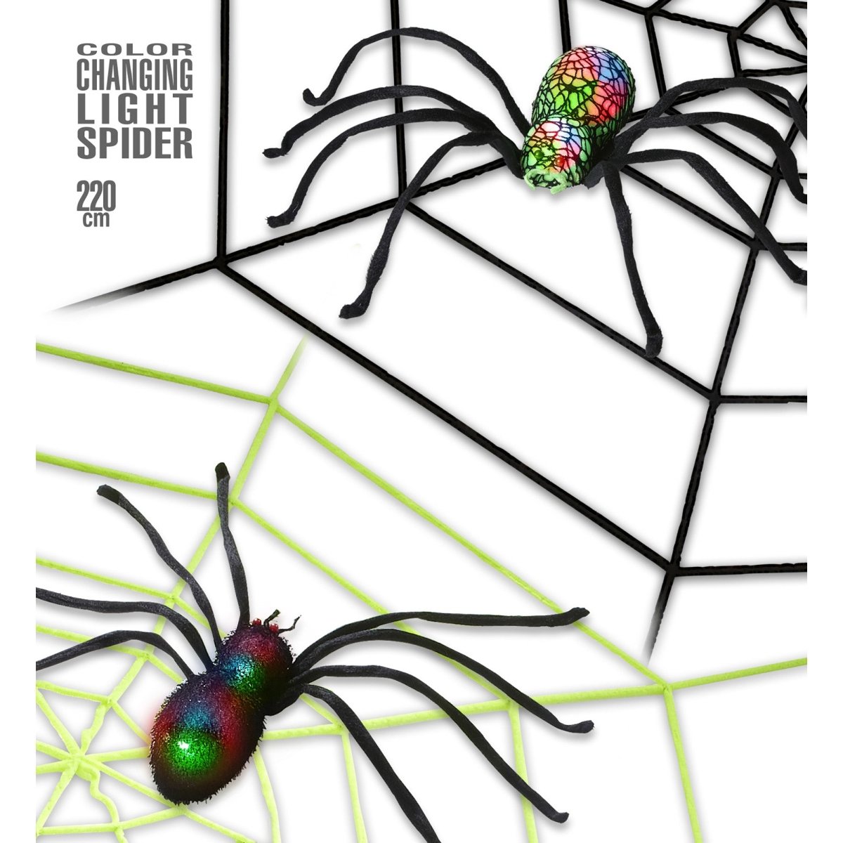 Crea un'atmosfera spettrale con questa ragnatela nera con ragno, perfetta per Halloween o per feste a tema. La ragnatela misura 220 cm ed è dotata di luci al neon che cambiano colore, per un effetto ancora più spettrale.