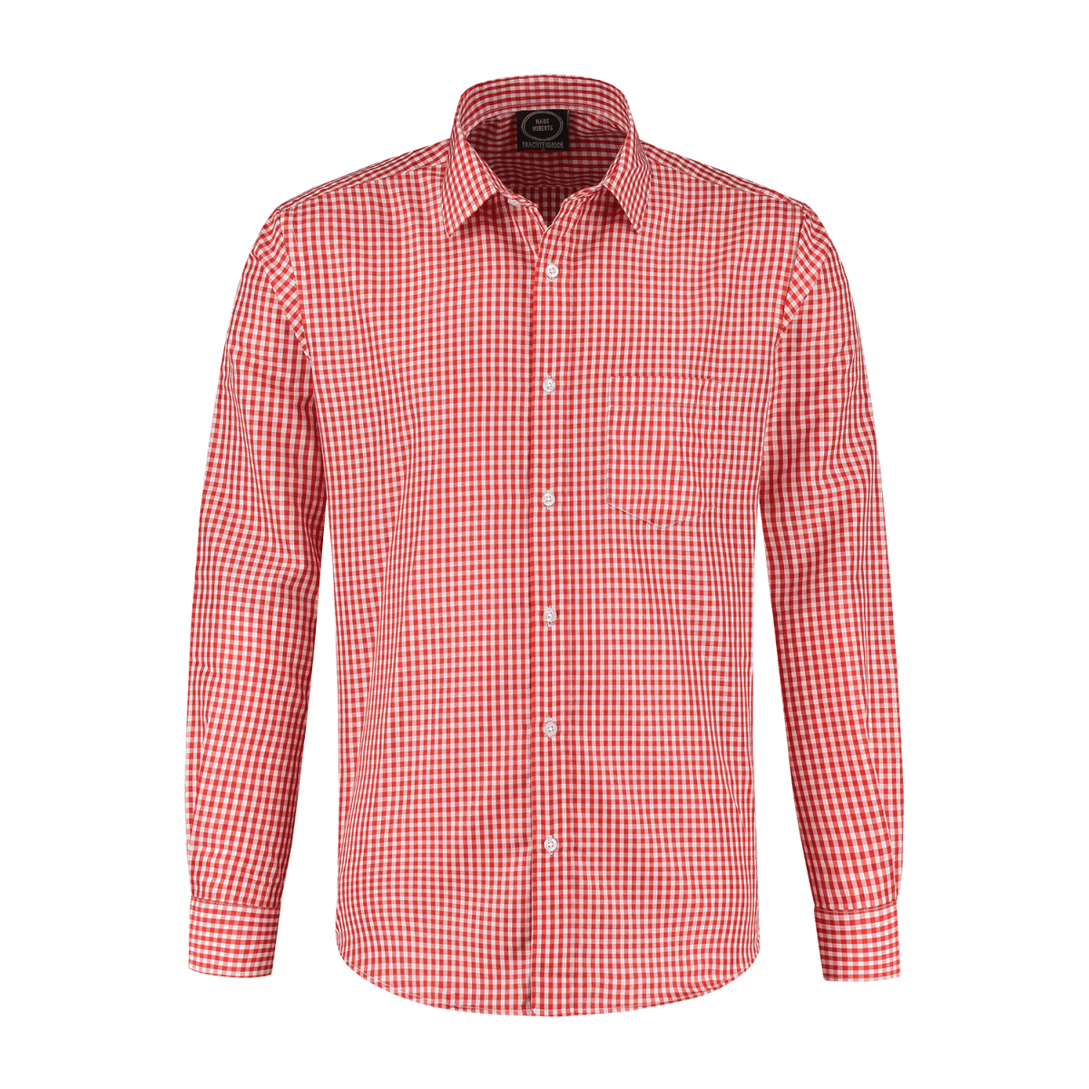 Camicia tradizionale a scacchi rossi e bianchi (a quadri piccoli). Comprende un taschino sul petto e un colletto alto. Vestibilità normale. 100% poli. Classica piega centrale sulla schiena per un maggiore comfort. 2 bottoni a ogni estremità delle maniche.