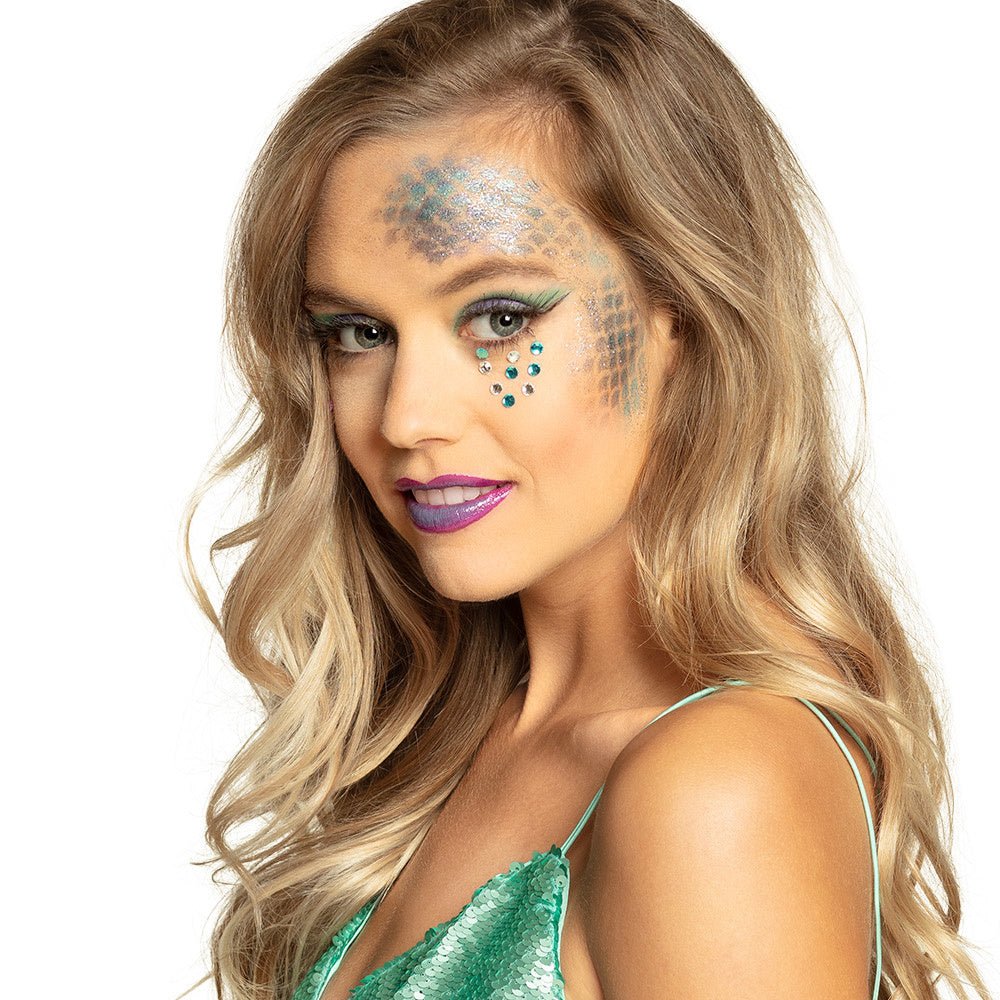 Contenuto della confezione: kit make-up Sirena, stencil, foglio adesivo con 14 gemme, vernice grassa, gel glitterato e spugna