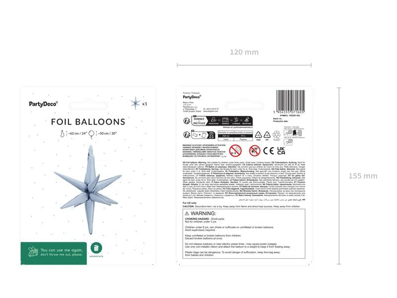Palloncino in foil smerigliato 3D Star di colore blu nebbioso, dimensioni prima del gonfiaggio circa 53 x 62 cm (21 x 24''), dimensioni dopo il gonfiaggio circa 50 cm (20''). Gonfiare con aria. Il set include una cannuccia.