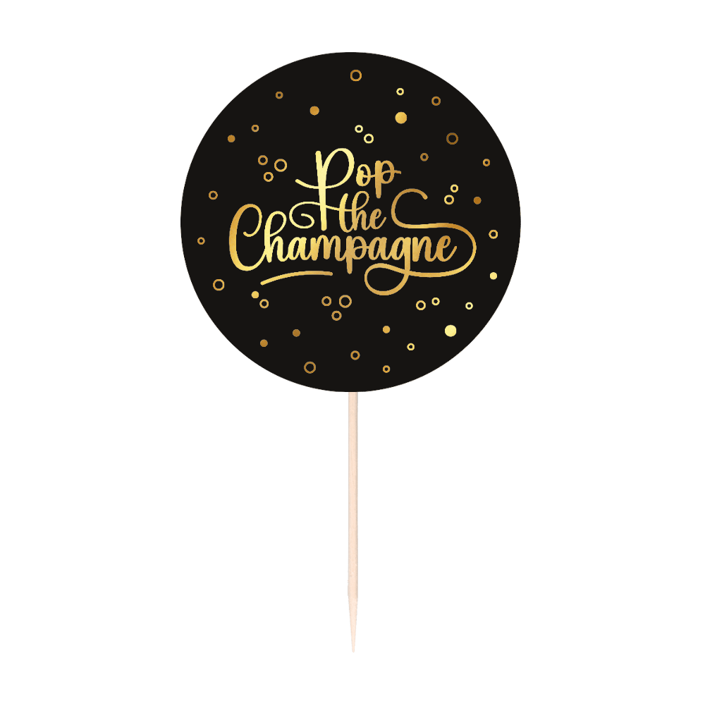 Stuzzicadenti festosi in nero con dettagli dorati, perfetti per spuntini, cupcake o altri dolcetti durante compleanni, feste di Capodanno o altre occasioni di festa.