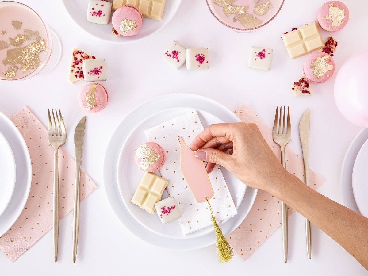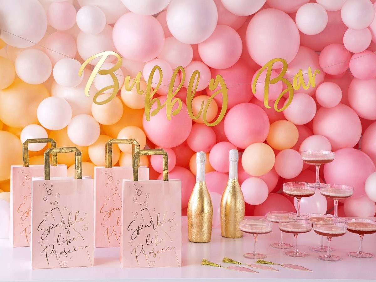 Contenuto: Segnaposti in carta di colore rosa con stampa metallizzata oro e cordoncino di lettura oro, dimensioni della bottiglia circa 3,5 x 10 cm, dimensioni della bottiglia con nappina circa 3,5 x 16 cm. (1 PKT/6 pz)