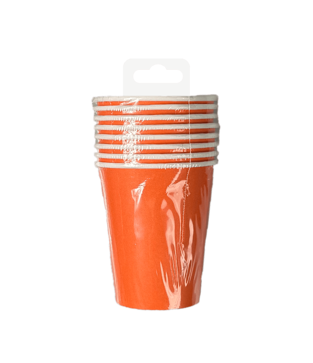 Le tazze arancioni sono l'elemento decorativo perfetto per una festa che ha come tema l'arancione. Queste tazze hanno dimensioni di 8,5 x 7 cm, sono confezionate per 8 e si abbinano perfettamente agli altri articoli arancioni come i coriandoli, i tovaglioli, i piatti, le tovaglie, le scatole per gli snack e la linea di bandiere. Presenta questi articoli insieme in modo che sia subito chiaro al cliente in cosa consiste questa collezione. Questi bicchieri sono realizzati in carta, il che li rende una scelta ecologica!