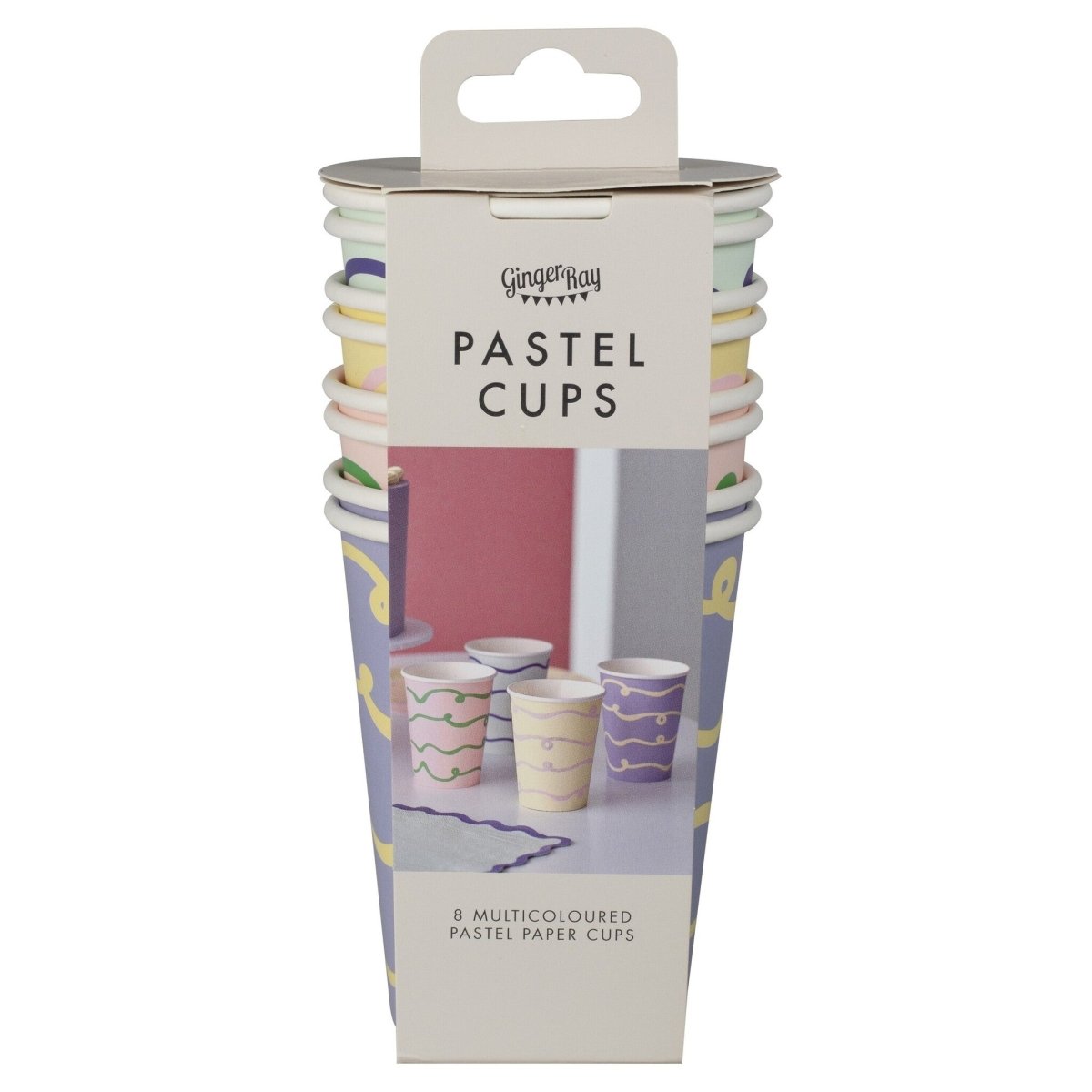 Comprende 8 bicchieri di carta color pastello nei colori lilla, giallo, verde e rosa.
