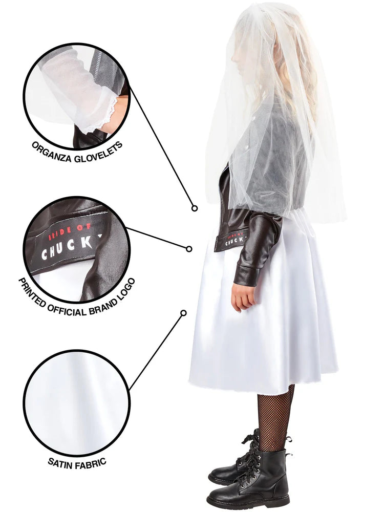 Lascia che il tuo piccolo fan dell'horror si trasformi in Tiffany, la famigerata Sposa di Chucky. Grazie a questo completo, che include un abito con giacca, velo e guanti, si trasformerà in pochi secondi nell'iconica bambola della famosa serie di film. Divertimento extra: combinalo con i costumi coordinati di Chucky e Tiffany per tutta la famiglia, dai più piccoli agli adulti.