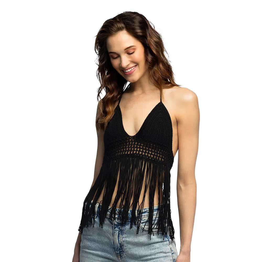 Lascia che il sole splenda con questo simpatico top nero all'uncinetto in taglia M! Il motivo decorativo al centro e le frange giocose sul fondo conferiscono al crop top un vero e proprio look boho. Perfetto per attirare l'attenzione in occasione di festival, feste in spiaggia o giornate di sole in città.