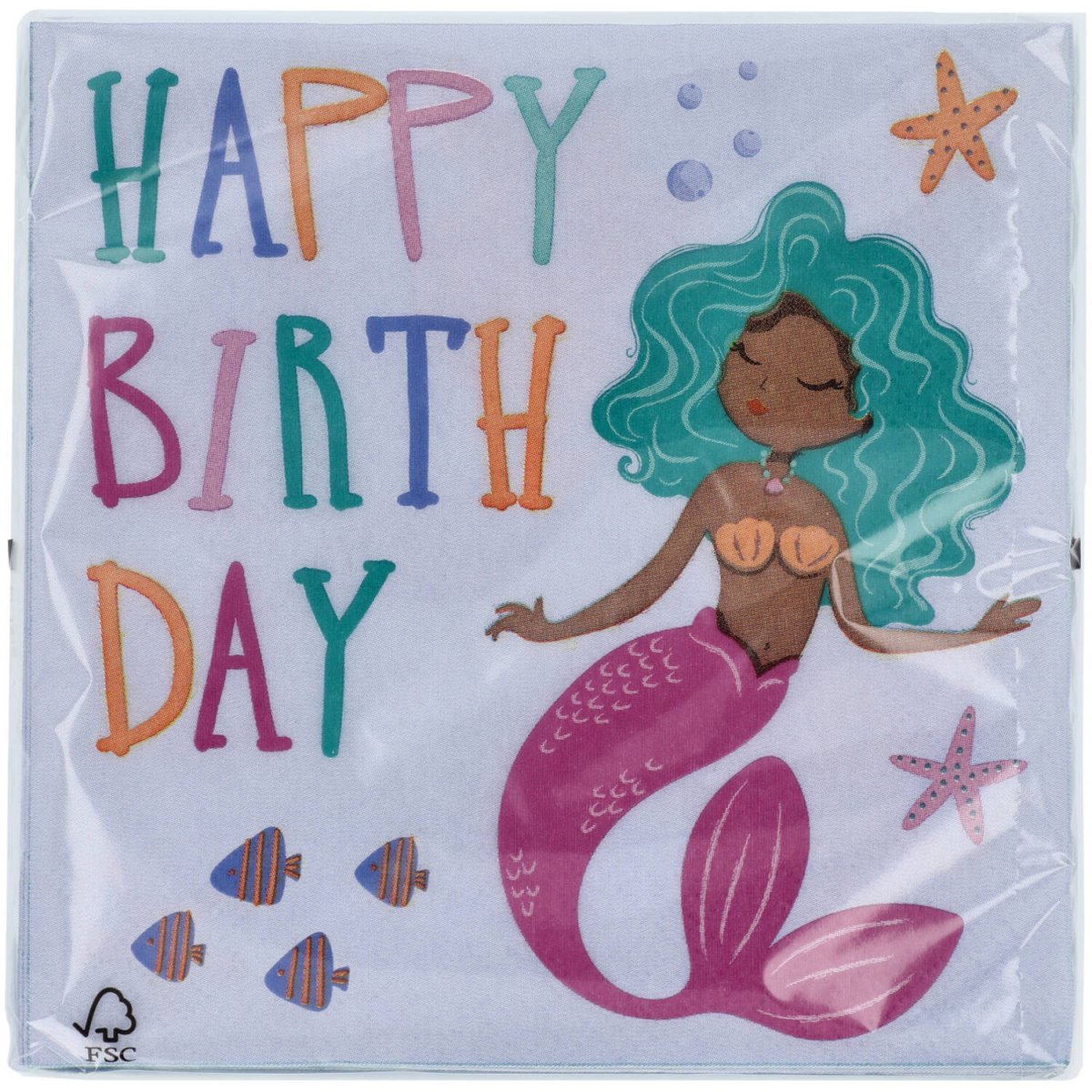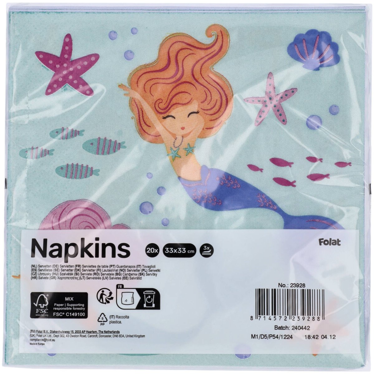 Tutte le sirene a tavola! Tovaglioli - Mermaid Magic - 33 x 33 cm - 20 pezzi. Contenuto: 20 tovaglioli. Da utilizzare ad esempio nelle seguenti occasioni di festa: Festa per bambini, Compleanno. Tovaglioli con bellissime sirene e i loro tesori sottomarini. I tovaglioli hanno un lato viola/blu con una sirena e il testo "HAPPY BIRTHDAY" e un lato verde menta con due sirene. Questi tovaglioli appartengono alla collezione Mermaid Magic di