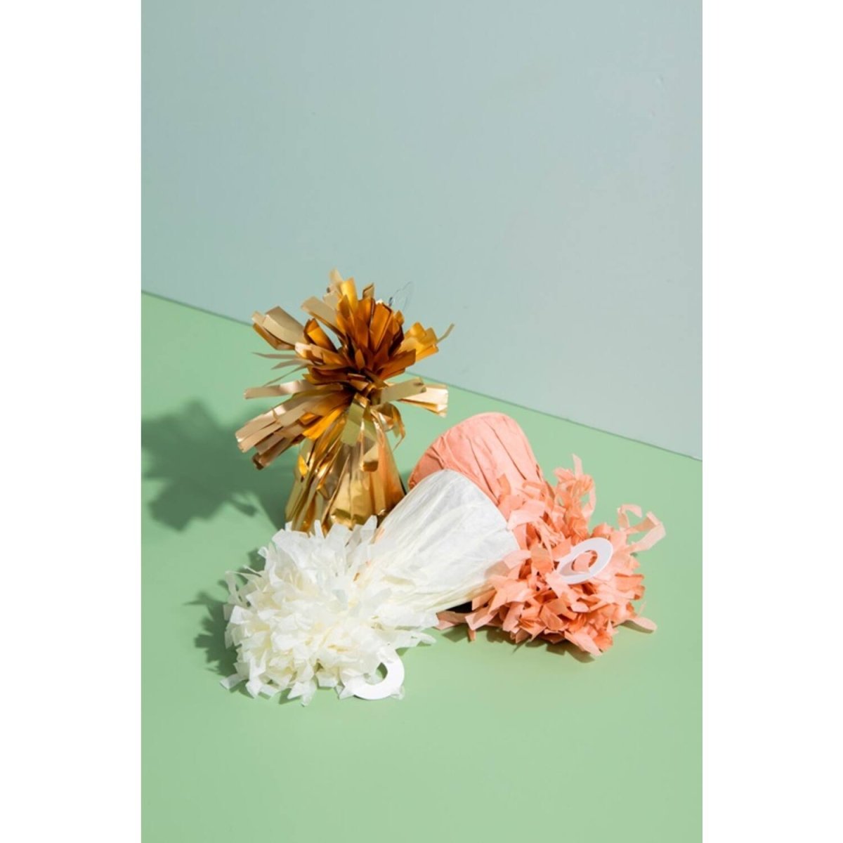 I palloncini riempiti di elio non volano via, ma fluttuano nell'aria. Da utilizzare, ad esempio, durante le seguenti occasioni di festa: Compleanno, Festa per bambini, Anniversario. Questo peso per palloncini è avvolto in carta e presenta delle frange nella parte superiore. Si abbina perfettamente alla nostra collezione di palloncini in foil (forme e numeri) con finitura ultra opaca.